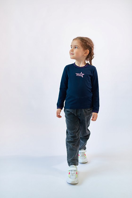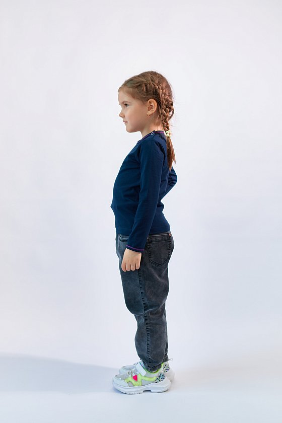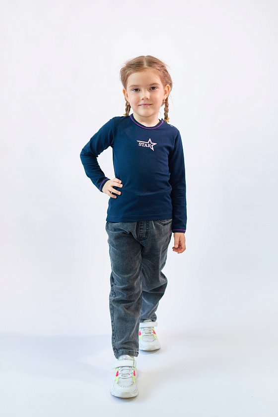 Футболка из однотонной кулирки с лайкрой с длинным втачным рукавом. С застежкой на плече на кнопки, спереди нанесён термопринт.