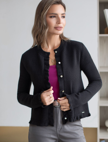 50%Вис 20%ПА 20%ПЭ 10%Кашемир Жакет жаккардовой вязки выполнен из нежной пряжи на основе вискозы с добавлением кашемира. Модель с круглым вырезом и золотистой фурнитурой выглядит дорого и роскошно, приятно ощущается на теле и поддерживает комфортный микроклимат. Совет стилиста: сочетайте с однотонными брюками, юбкой, платьем или джинсами. Можно использовать в комплекте total-look с D39.362 и с платьем D32.110