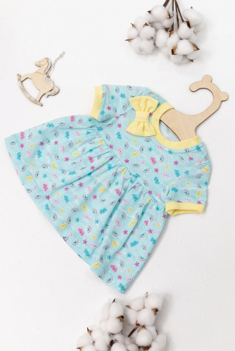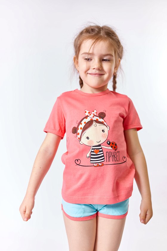 Костюм детский выполнен из кулирки, 100% хлопок. Футболка с коротким рукавом, на правом плече застёжка на пуговицы. Горловина и низ рукавов обработаны бейкой. Спереди на футболке нанесён принт. Шорты обработаны бейкой контрастного цвета, пояс на резинке, по бокам расположены карманы.