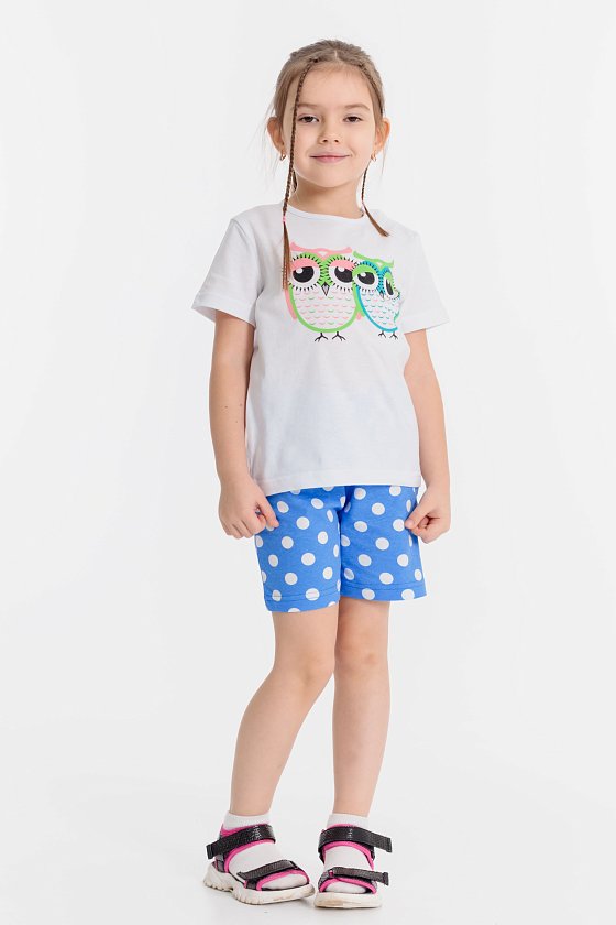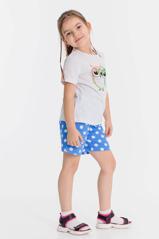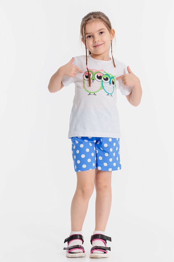 Летний комплект состоит из шорт и футболки. Футболка однотонная, из кулирки, с красивым принтом. Застёжка на кнопки на плече. Рукав короткий. Шорты из кулирки с рисунком в горошек, пояс на резинке.