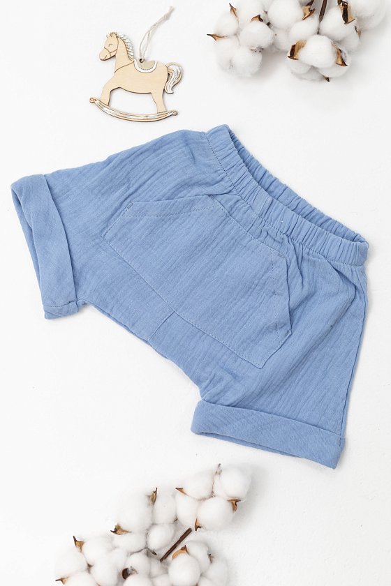 Шорты выполнены из муслиновой ткани. Покрой свободный, под памперс.