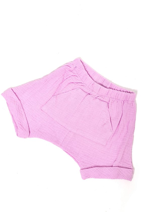 Шорты выполнены из муслиновой ткани. Покрой свободный, под памперс.