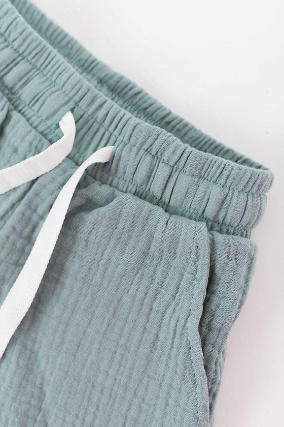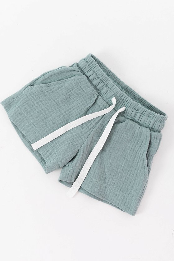 Шорты выполнены из лёгкого однотонного муслина. Пояс на резинке со шнуром позволяет регулировать посадку. По бокам размещены карманы. Эти шорты будут прекрасным выбором для повседневной носки, игр и прогулок. Сочетание комфорта, стиля и качественной ткани делают их отличным вариантом для гардероба вашего малыша.