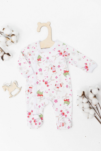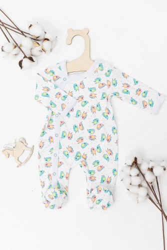 Комбинезончик для девочек выполнен из 100% хлопковой ткани с набивным рисунком. С длинными рукавами под бейку и удобной смещённой застежкой на кнопках по всей длине изделия.