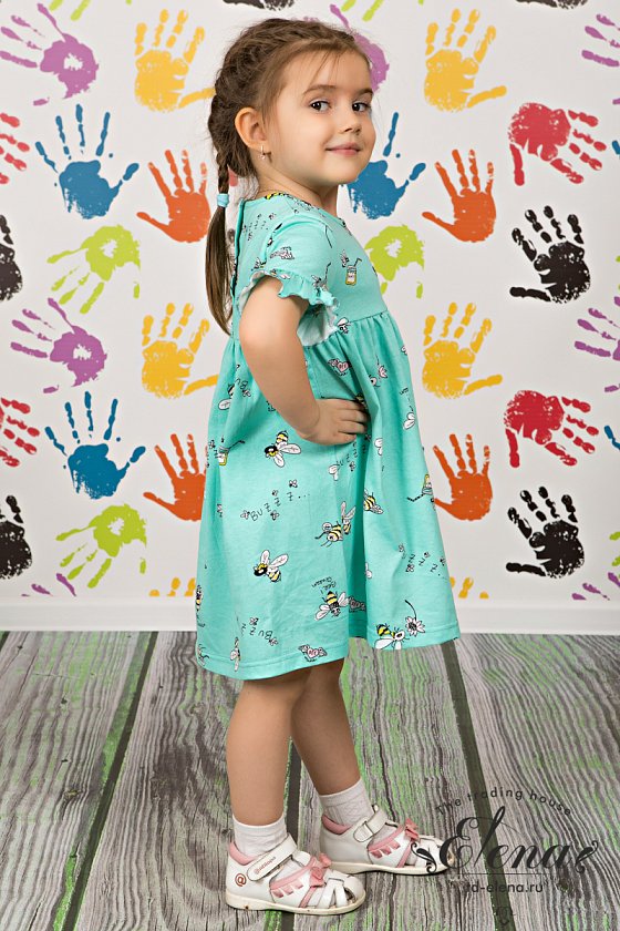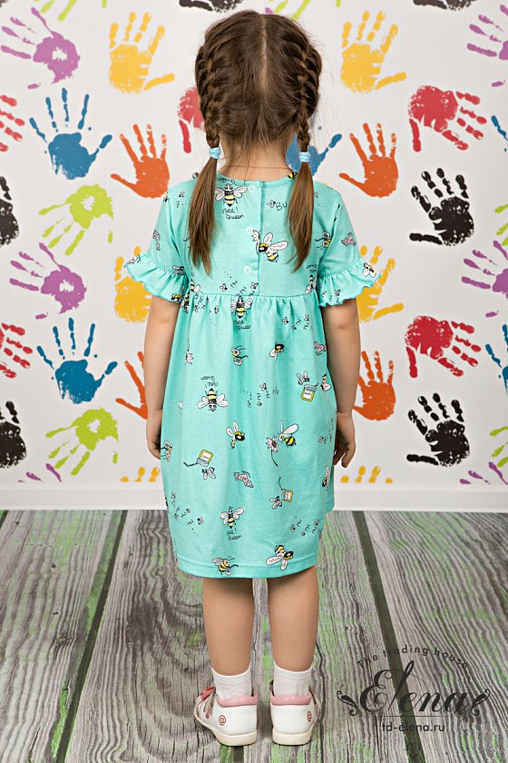 Платье из кулирки с набивным рисунком. С отрезной юбкой на сборке. Короткий рукав с оборкой, на спинке застёжка на кнопки.