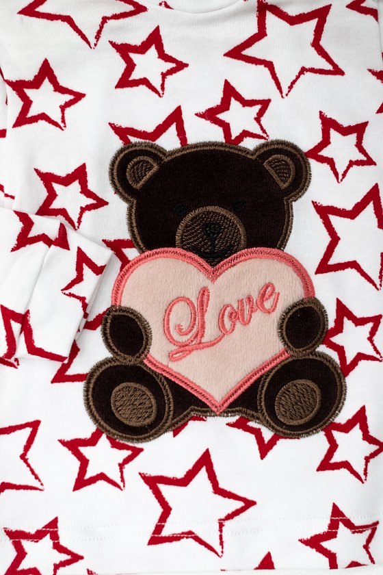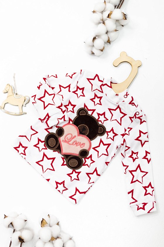 Водолазка из интерлока с застёжкой на кнопках на плече. Длинные рукава с манжетами, спереди аппликация.