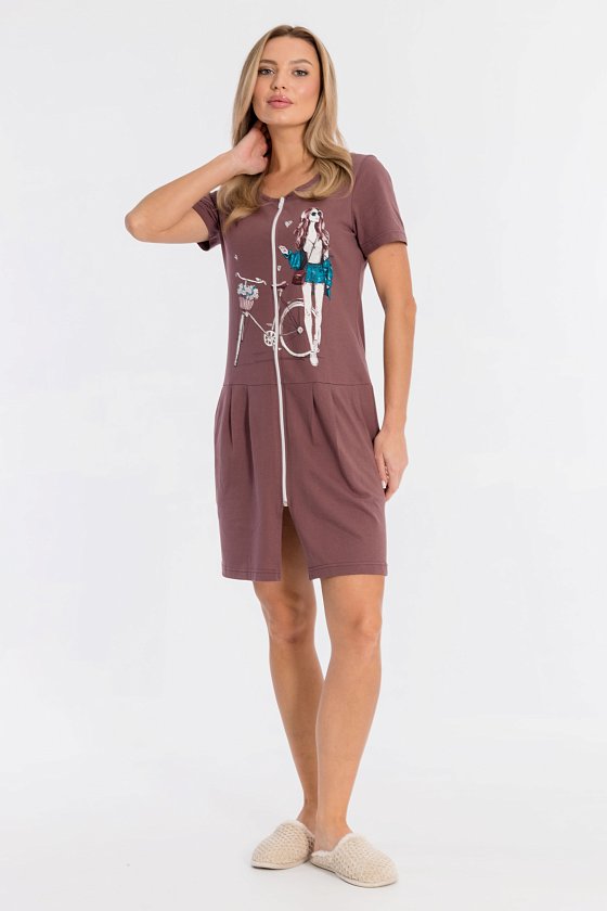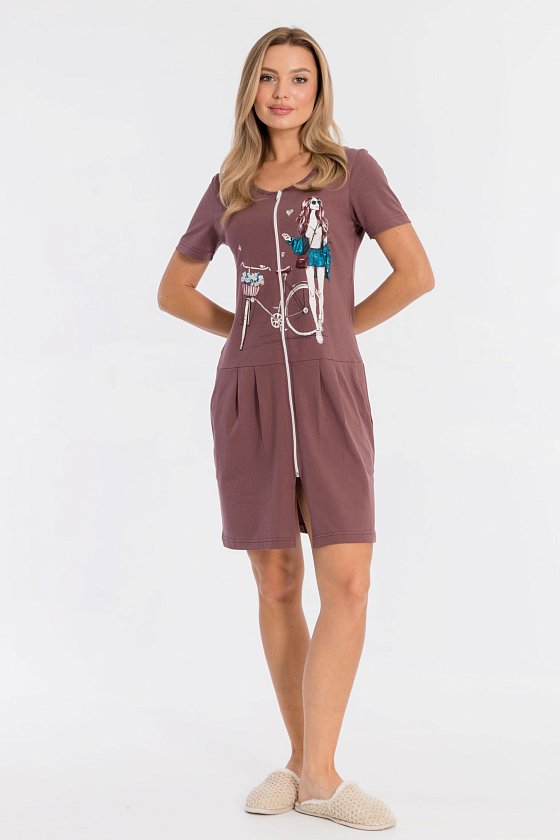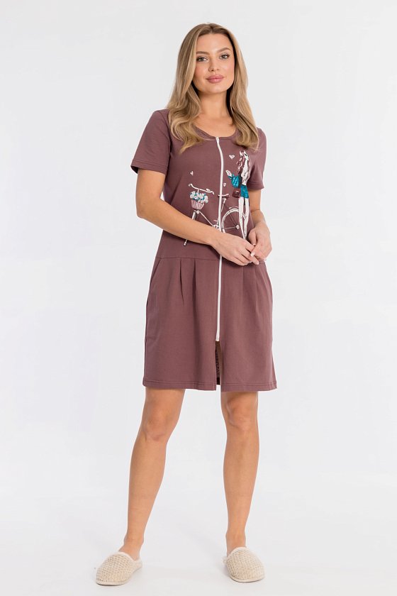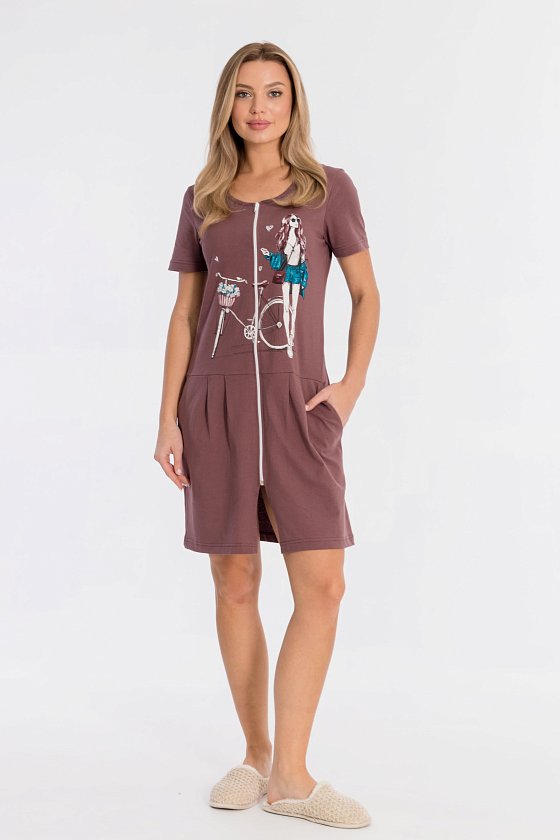 Халат на молнии выполнен из однотонной кулирки, 100% хлопок. По бокам размещены карманы, от отрезной линии талии заложены складки. Спереди нанесён красивый принт.