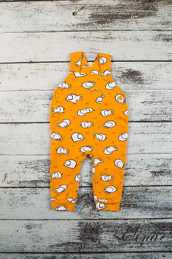 Комбинезон выполнен из футера с лайкрой с набивным рисунком. Бретели и боковые швы с застёжкой на пуговицы. На груди накладной карман. По низу манжеты.