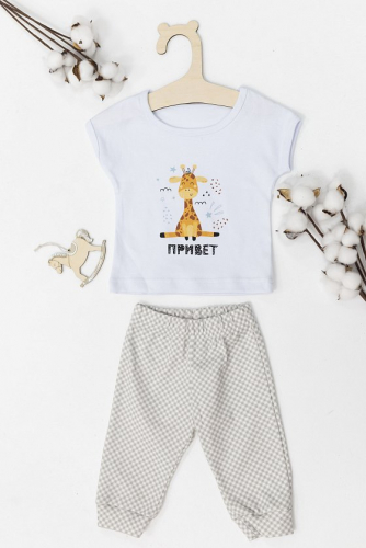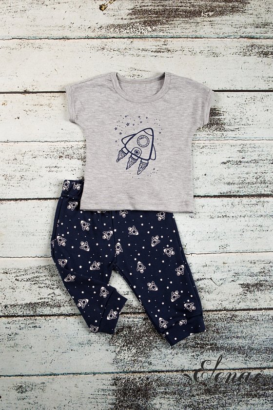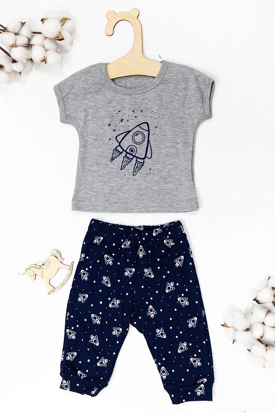 Костюм детский выполнен из интерлока. Футболка с коротким рукавом, с круглым вырезом горловины и принтом спереди. Брюки на манжете снизу и на резине по поясу.