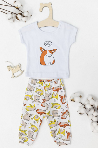 Костюм детский выполнен из интерлока. Футболка с коротким рукавом, с круглым вырезом горловины и принтом спереди. Брюки на манжете снизу и на резине по поясу.