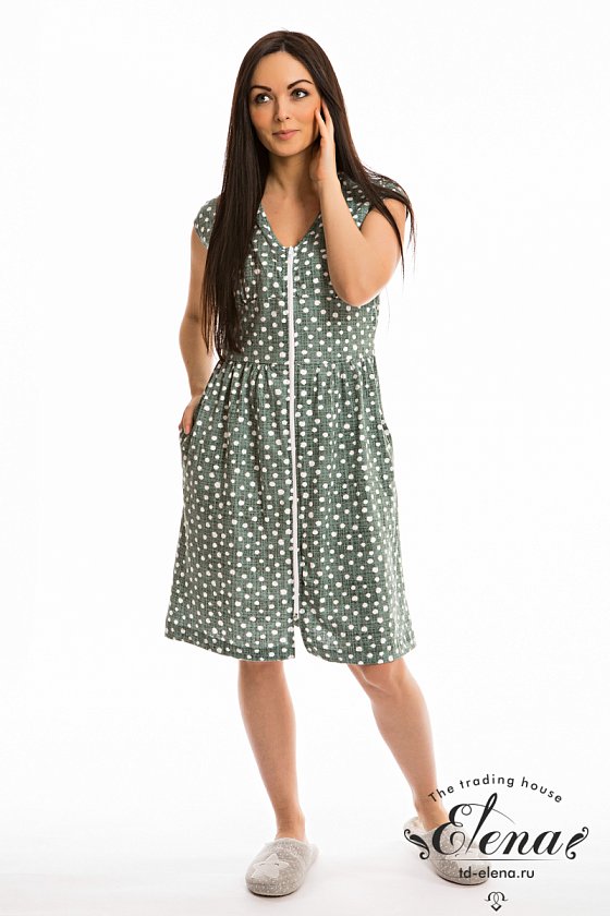 Халат выполнен из х/б полотна с набивным рисунком. Халат застёгивается на молнию, в боковых швах расположены карманы. Горловина и проймы обработаны бейкой. Сзади расположен фиксирующий по талии пояс.