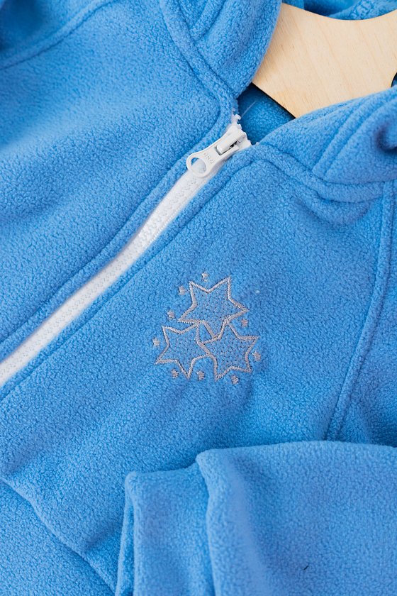 Детский костюм выполнен из флиса. Толстовка с капюшоном, длинными рукавами на манжетах и застёжкой на молнию. С левой стороны расположена вышивка. Брюки на манжетах внизу, пояс на резинке.