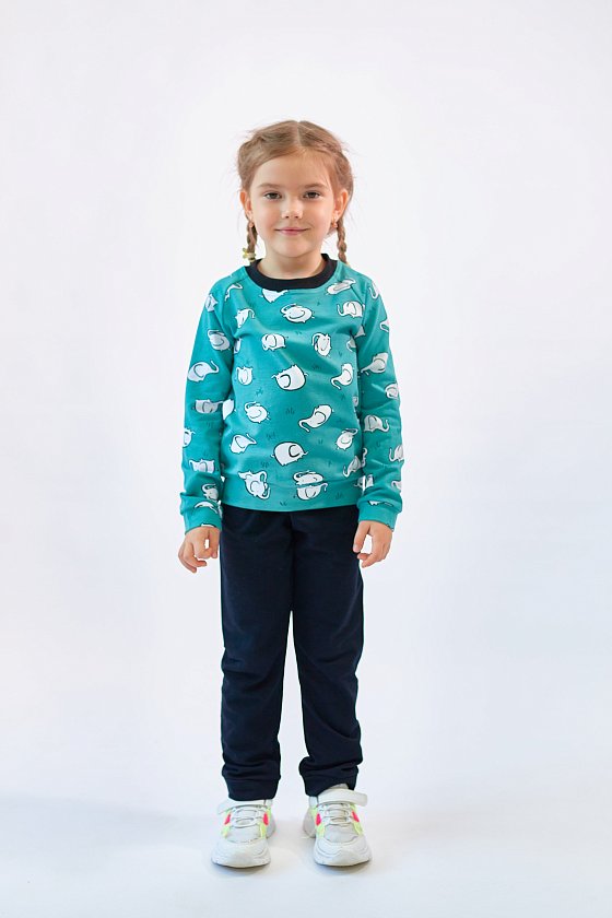 Детский костюм выполнен из футер петли c лайкрой, состоит из брюк и толстовки. Толстовка с рукавом покроя реглан, круглый вырез горловины с отделкой из рибаны. Брюки с поясом на резине и манжетами внизу.