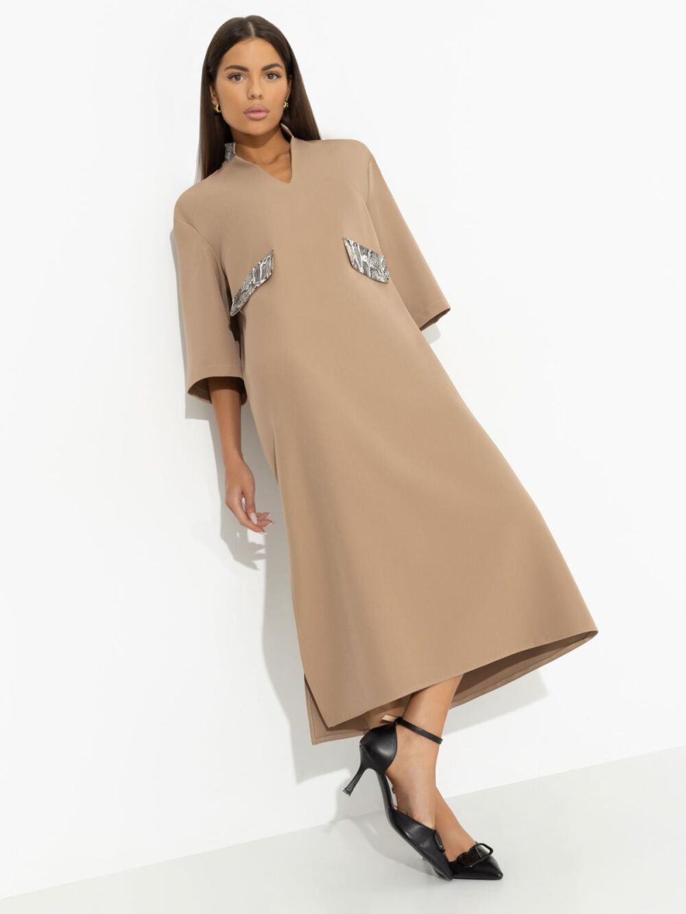Быть финансово грамотной, значит покупать модное платье CHARUTTI. Если он спросит, какая здесь взаимосвязь, расскажи ему о своих навыках заряжать мужчину на улучшение благосостояния и об универсальном крое платья на все случаи семейной жизни. Платье свободного кроя в длине миди. Есть разрезы по бокам изделия. Имитация карманов с использованием акцентного материла из экокожи. V-образный вырез зоны декольте. Воротник-стойка из экокожи.