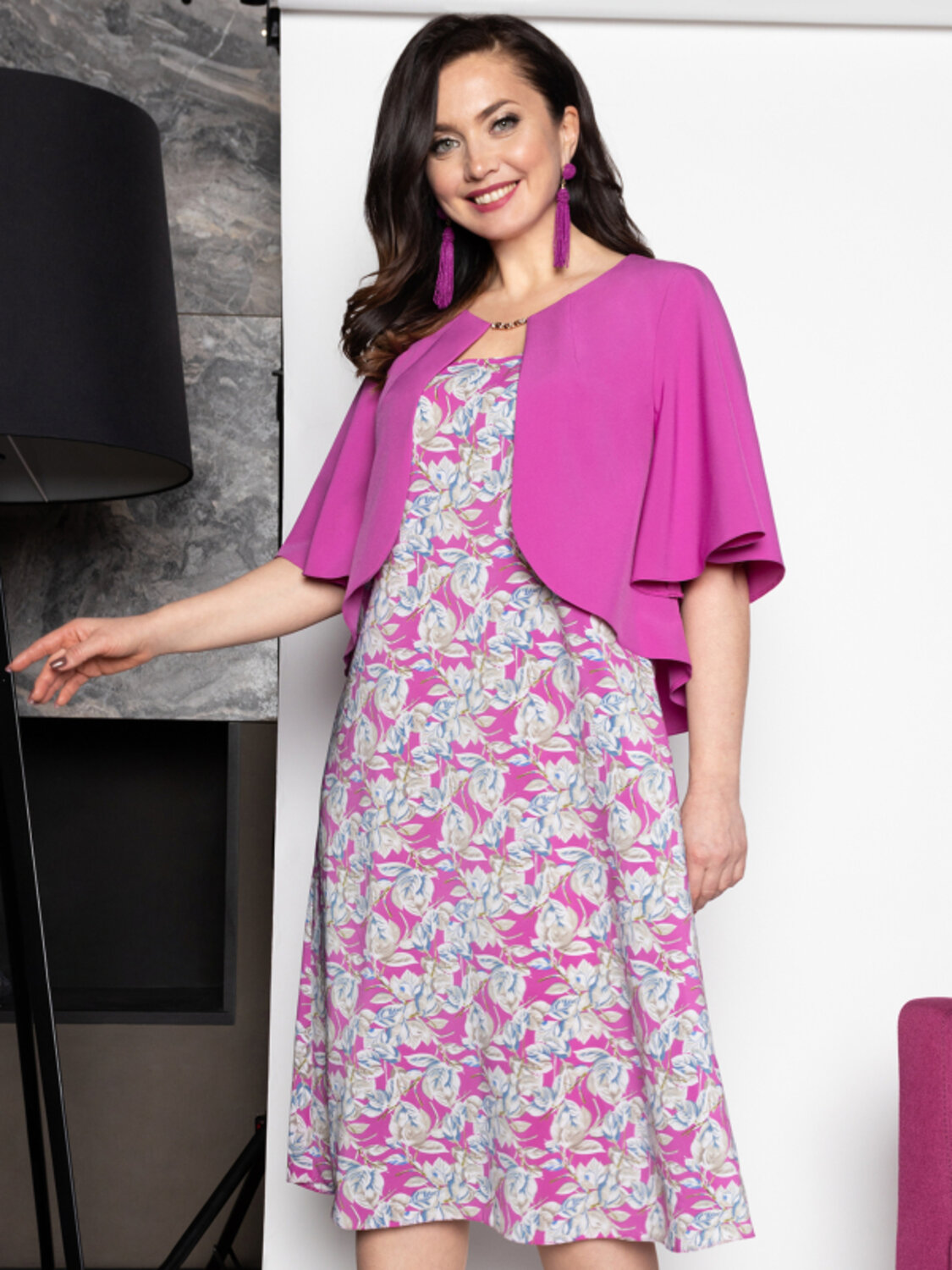 Совершенное платье! Сочетание цветов точно привнесёт позитивные нотки в ваши будни! Розовый подходит каждому цветотипу. Имитация накидки с красивой деталью моделирует силуэт и позволяет чувствовать себя на высоте.