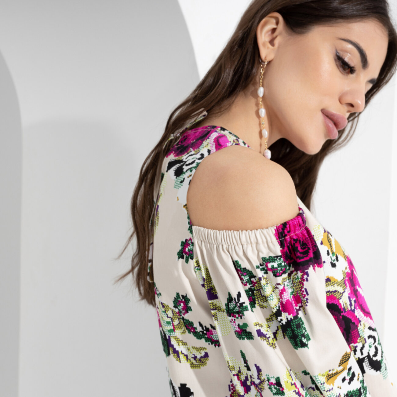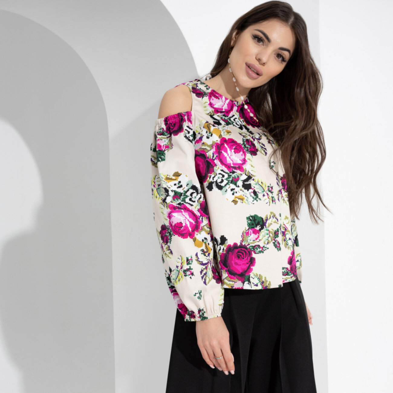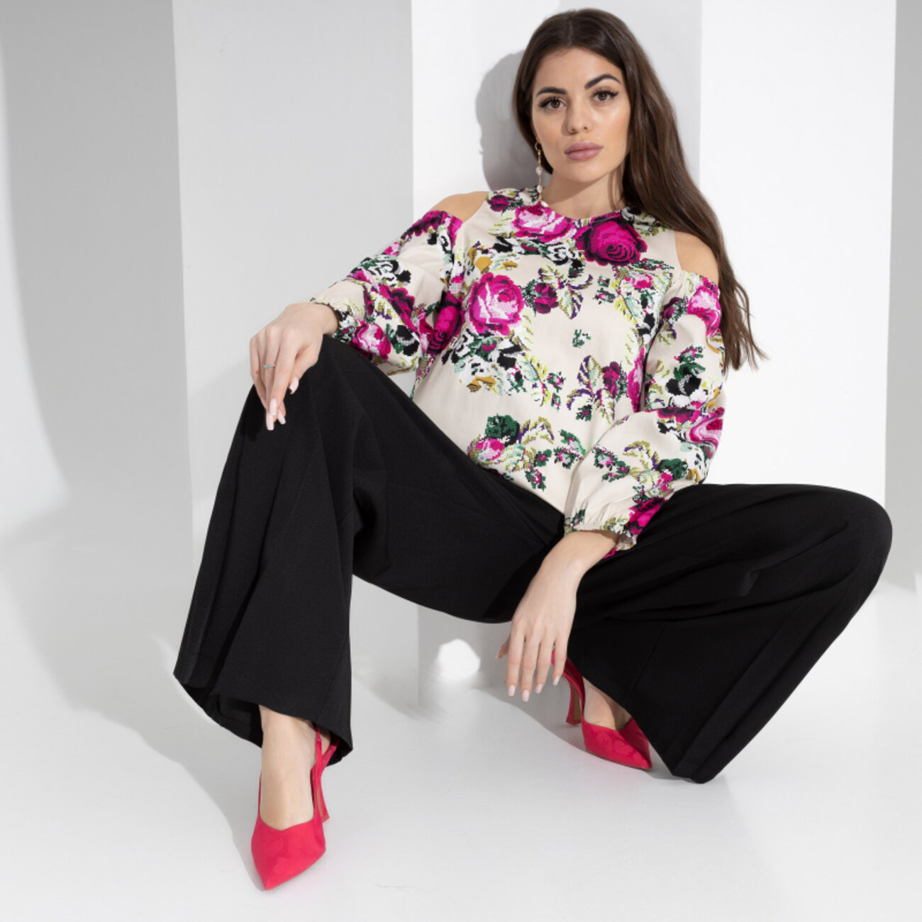 Блуза с классическим принтом цветы. Но это только на первый взгляд, принт выполнен в трендовой технике «обман зрения». Обнаженные плечи, романтические объемные рукава. Отличный выбор современной леди.