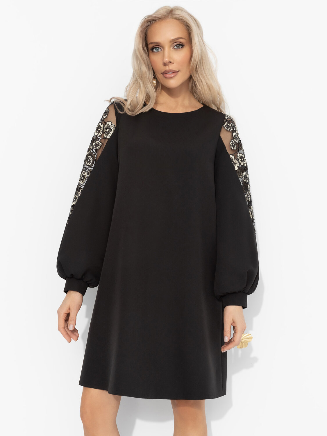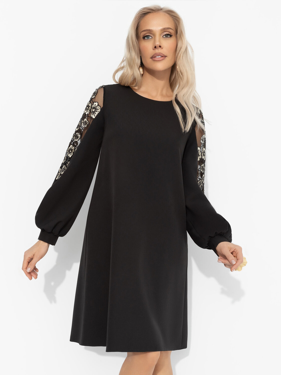 Платье, в котором ночь обретает блеск. Бархатный чёрный, сияние пайеток и вышивка – как откровение между вздохами. Элегантность, умеющая флиртовать. Платье с полупрозрачными вставками и вышивкой на рукавах. Свободный крой дарит комфорт и уверенность в каждом движении. Подойдет на любой тип фигуры.
