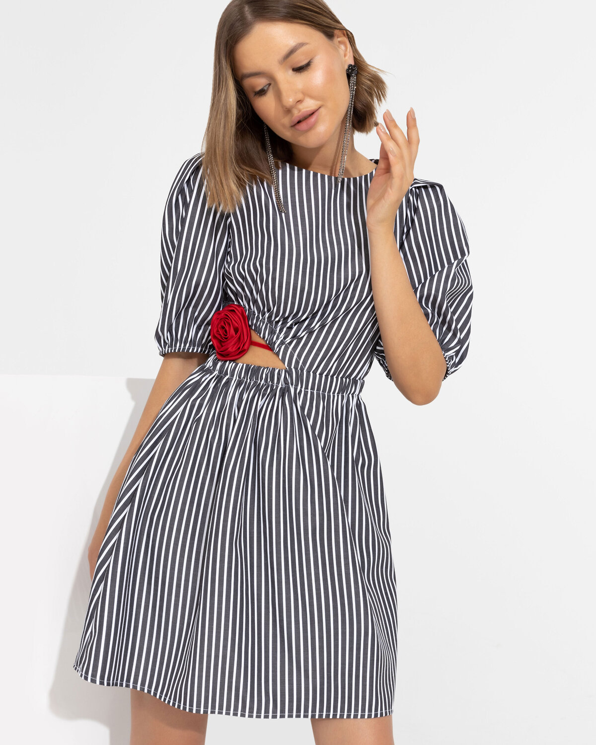 Иногда об одном мгновении мы вспоминаем долгие годы. Чтобы таких моментов было больше, наполни каждый день деталями. Эффектное платье-мини в полоску с пикантным трендовым разрезом – то, что нужно.