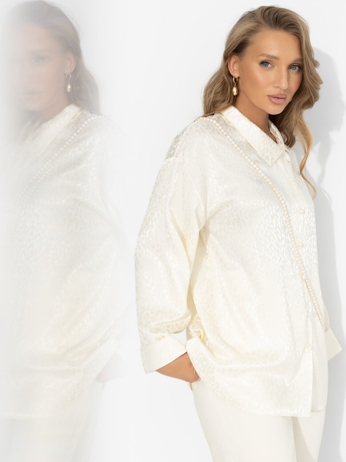 Она улыбается отражению в зеркале – уверенно, спокойно, с лёгким блеском в глазах. Её день только начинается, и образ с блузой будто подсказывает: всё получится. Мягкий свет, лёгкость движений и чуть заметная роскошь – её формула уверенности. Блуза из шёлка свободного кроя с длинными рукавами на манжете. Лишия застежки и воротник расположены асимметрично. Матовая фактура ткани подчёркивает деликатный блеск и мягко ложится по фигуре. Пуговицы-жемчужены определяют эту модель в категорию «тихая роскошь».