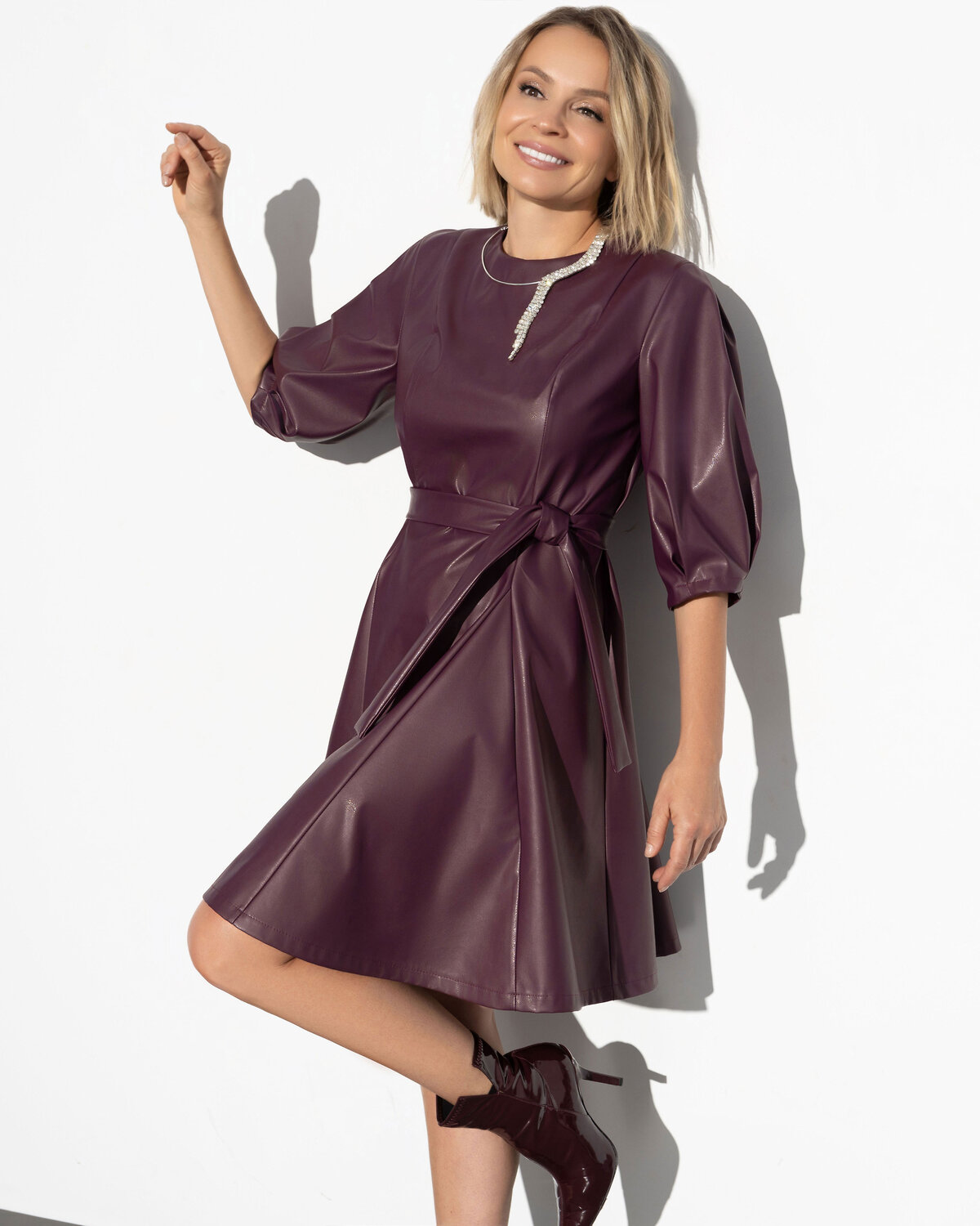 В бордовом платье из экокожи ты чаще проходишь мимо витрин, чтобы любоваться своим новым образом. Объемные рукава вдохновляют твоё природное очарование цвести даже в самые суровые холода!