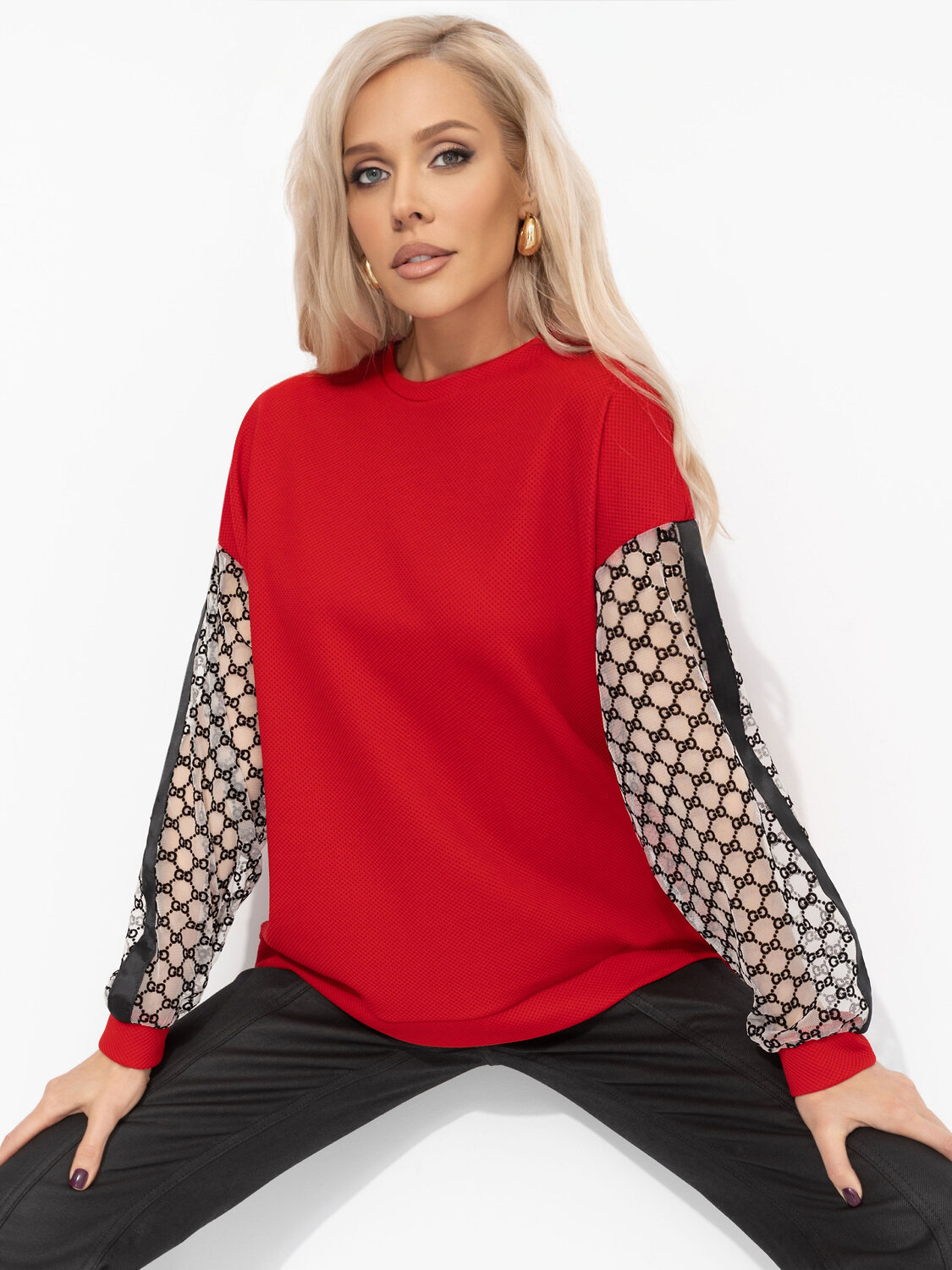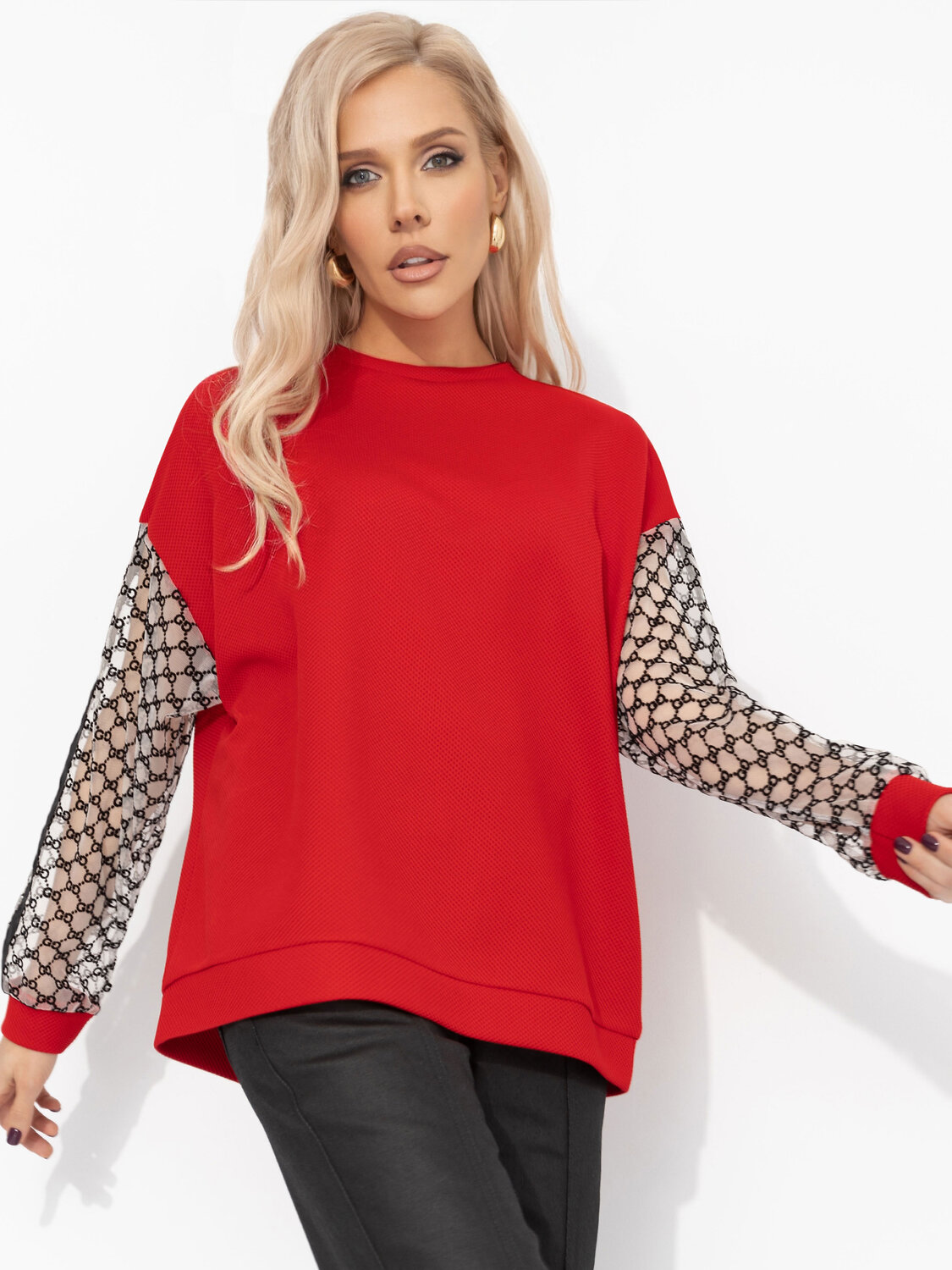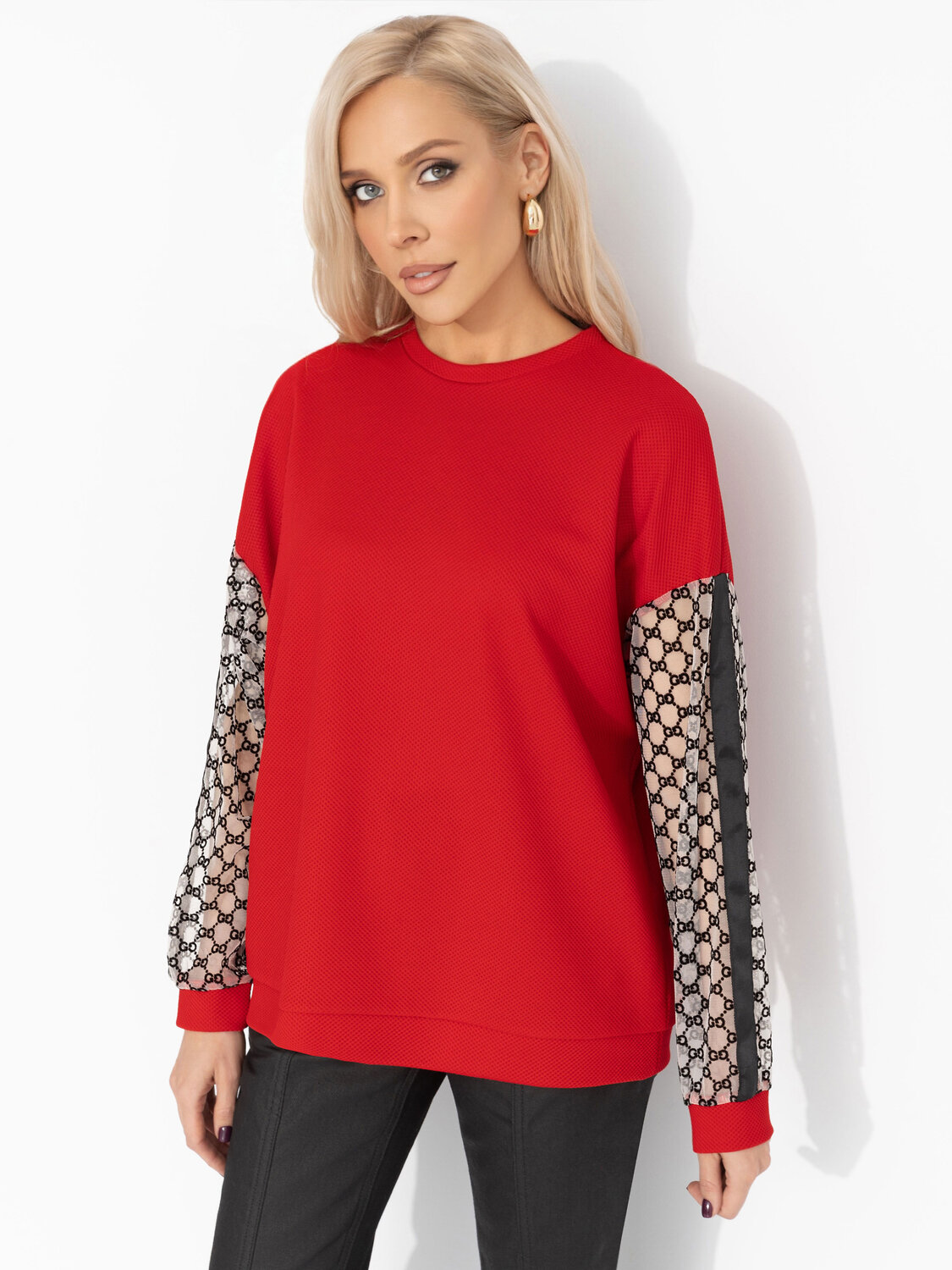 Свитшот ЧАРУТТИ насыщенного красного цвета – тот самый идеальный подарок, о котором ты сама мечтаешь. Его силуэт дарит ощущение безусловного уюта, в котором можно спрятаться от всего мира. Яркий, жизнеутверждающий оттенок поднимает настроение даже в самый хмурый день, заряжая энергией и уверенностью. В нём сочетается непринуждённая расслабленность и яркий акцент, делающий даже простой образ стильным и запоминающимся. Свитшот свободного кроя. Изделие удлиненное. Рукава декорированы акцентной тканью с текстурным узором и лампасами.