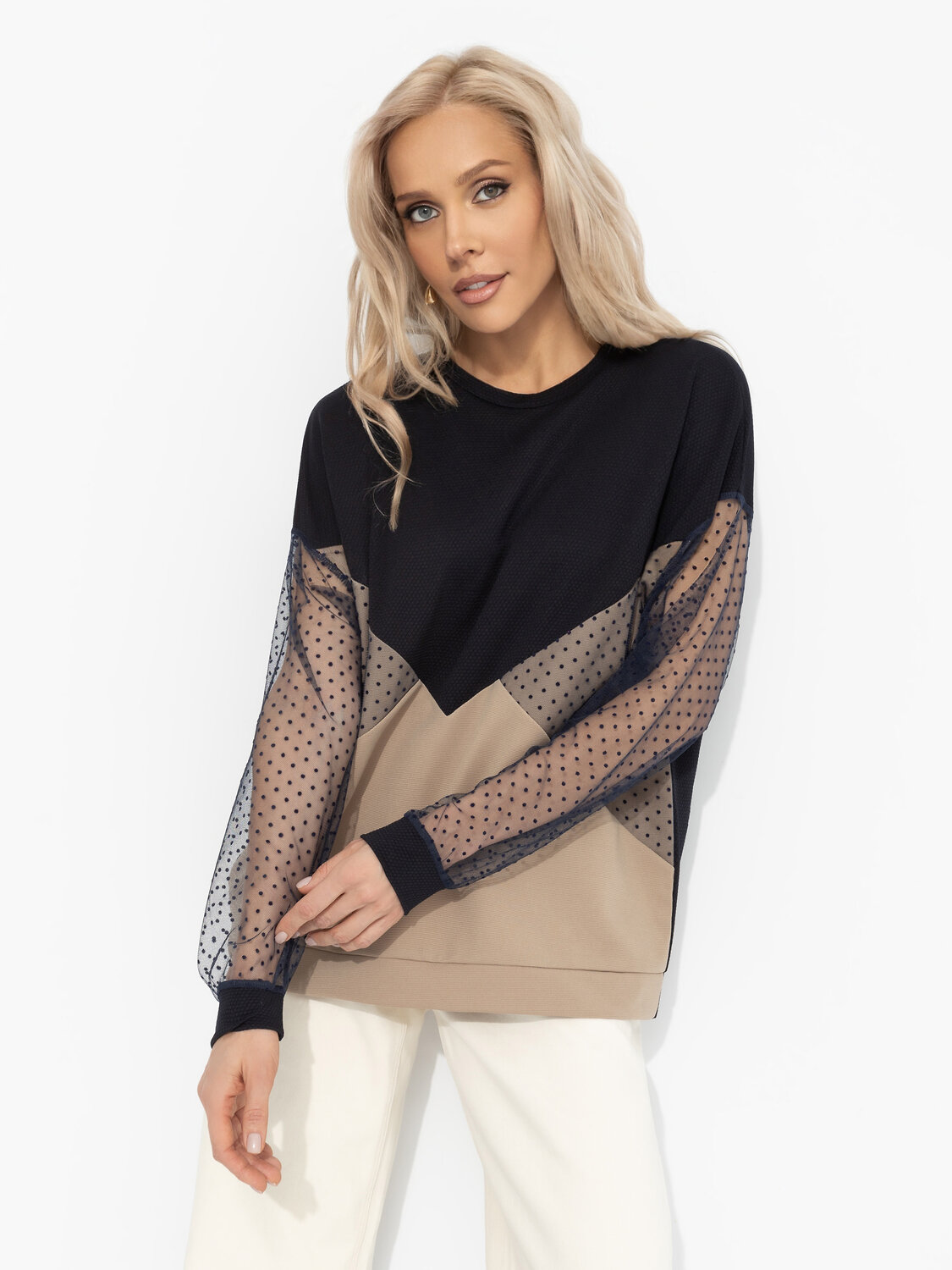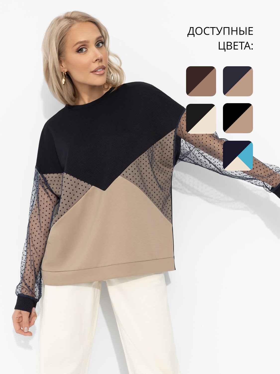 Кофе с подругой, прогулка по парку или день, когда просто хочется быть собой. Мягкий свитшот сочетает уют и лёгкий флирт – прозрачная сетка флак добавляет игре оттенков немного загадочности. Свободный силуэт, трендовая геометрия и благородные тона делают этот образ тем самым – любимым и комфортным. Свитшот свободной посадки.
