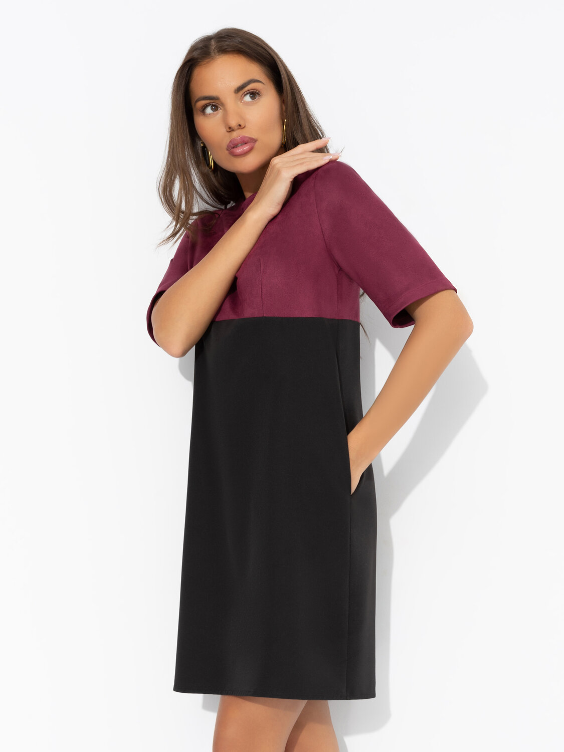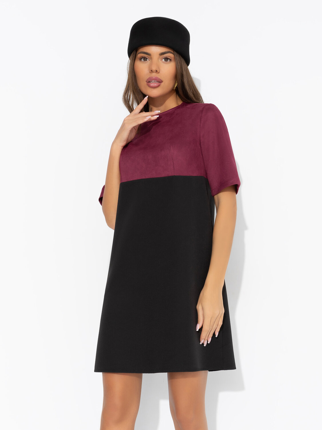 «Идеал красоты» в длине мини – это вызов, облечённый в замшу. Оно будто говорит: «Смотри, но не трогай». Платье трапециевидного силуэта в длине до колена. Комбинация двух видов ткани. Хорошо смотрится на любом типе фигуры. Изделие с карманами. Деликатная пуговица сзади.