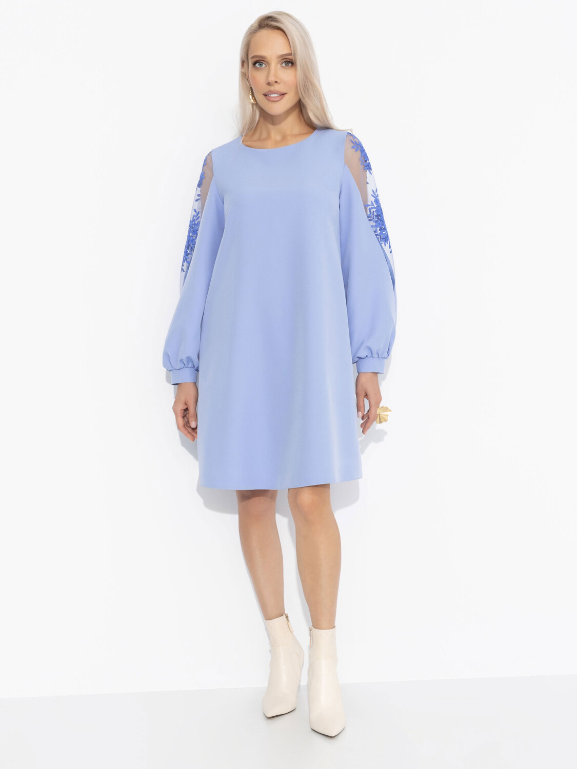 Она выбрала платье ЧАРУТТИ нежно-голубого цвета, словно окутанное воздушной дымкой предвкушения счастливого вечера. Каждый завиток кружевных узоров хранит шепот комплиментов. Она будто парила над землей, вызывая восторг окружающих. Когда вечер закончился, нежный цвет и кружево остались прекрасным воспоминанием об идеальном танце под тихую музыку ночного города. Платье трапециевидного силуэта в длине до колена. Длинные рукава-фонарики дополнены тонким кружевом в тон изделия. Платье хорошо смотрится на любом типе фигуры.