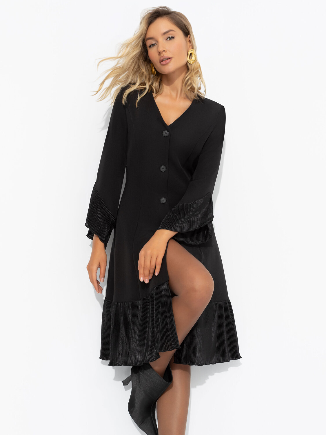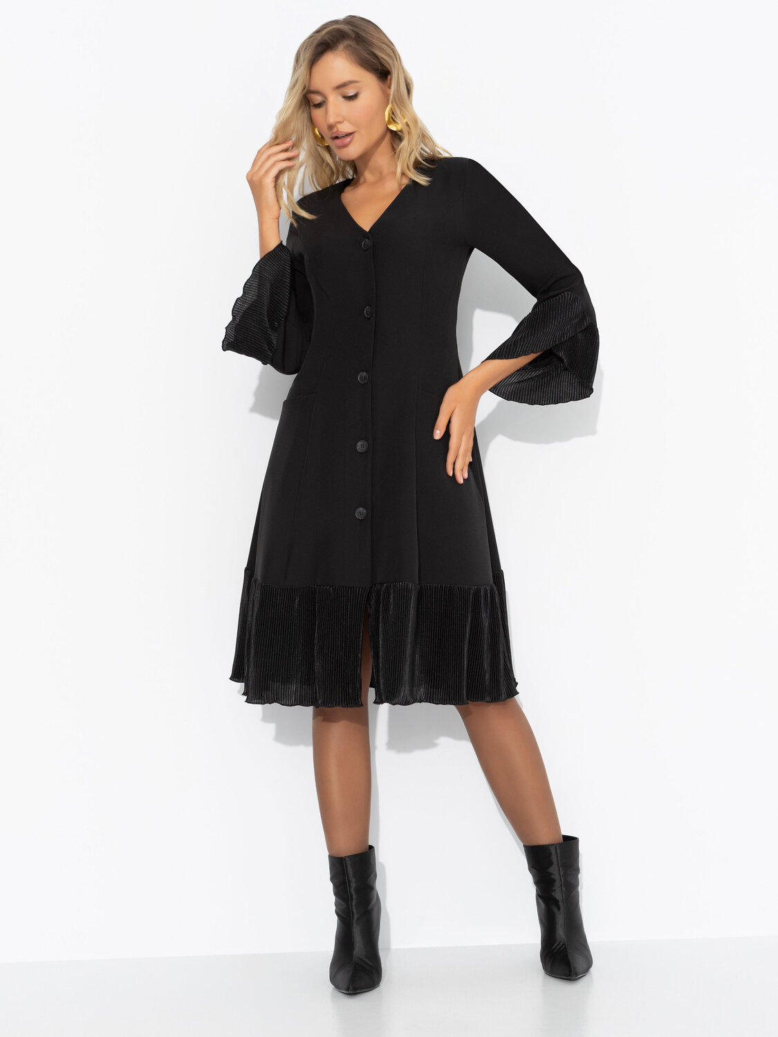 Платье ЧАРУТТИ как воплощение вашего уверенного и вдохновляющего стиля руководства. Безупречный силуэт подчеркивает собранность и целеустремленность, а струящиеся рюши говорят о мягкости и внимании к деталям. Идеальный баланс между элегантностью и современным подходом, который вы привносите в команду. Платье приталенного силуэта в длине миди. Подол изделия и рукава оформлены рюшами из акцентной ткани-гофре. Платье застегивается на пуговицы. Есть карманы.