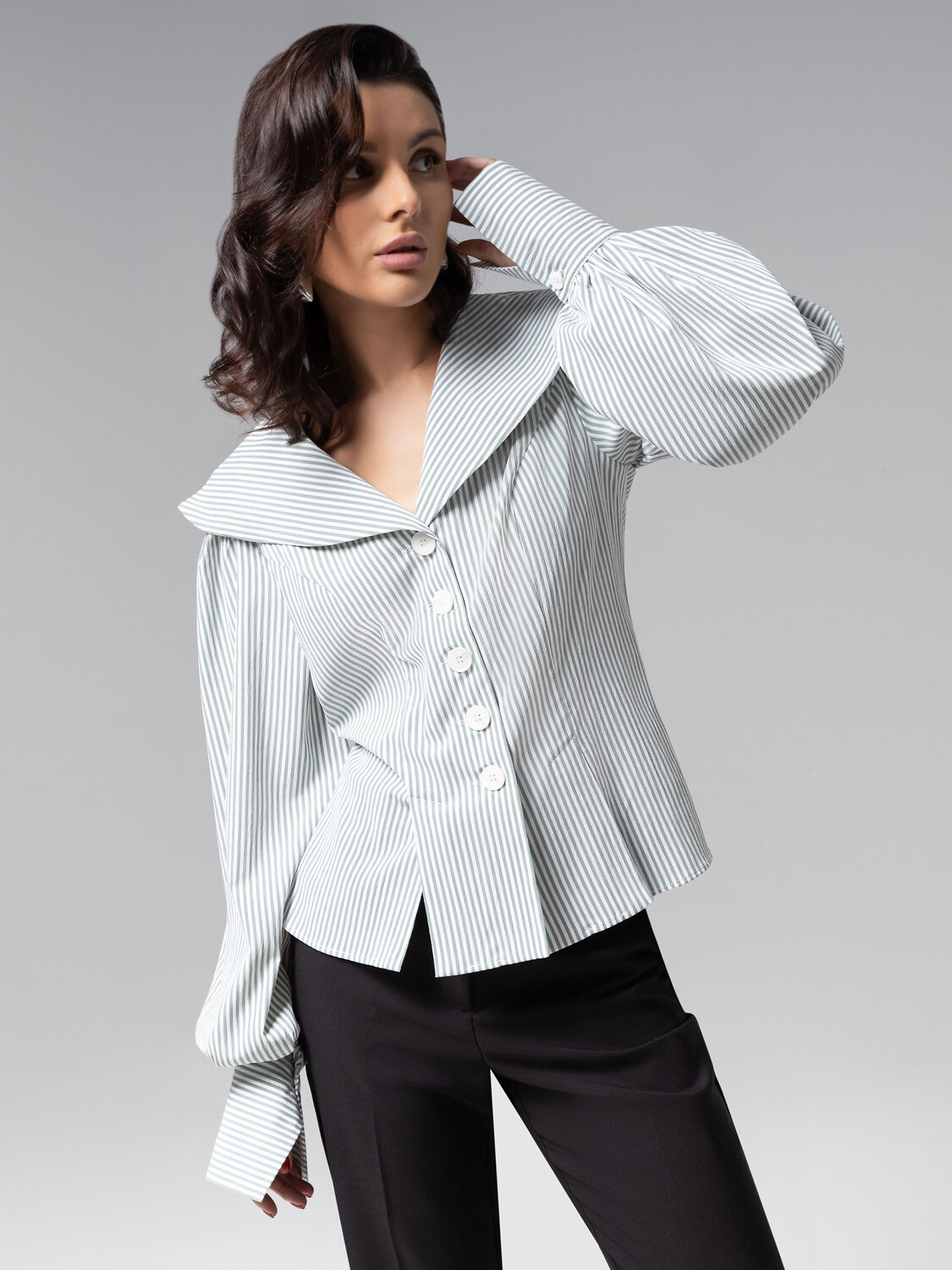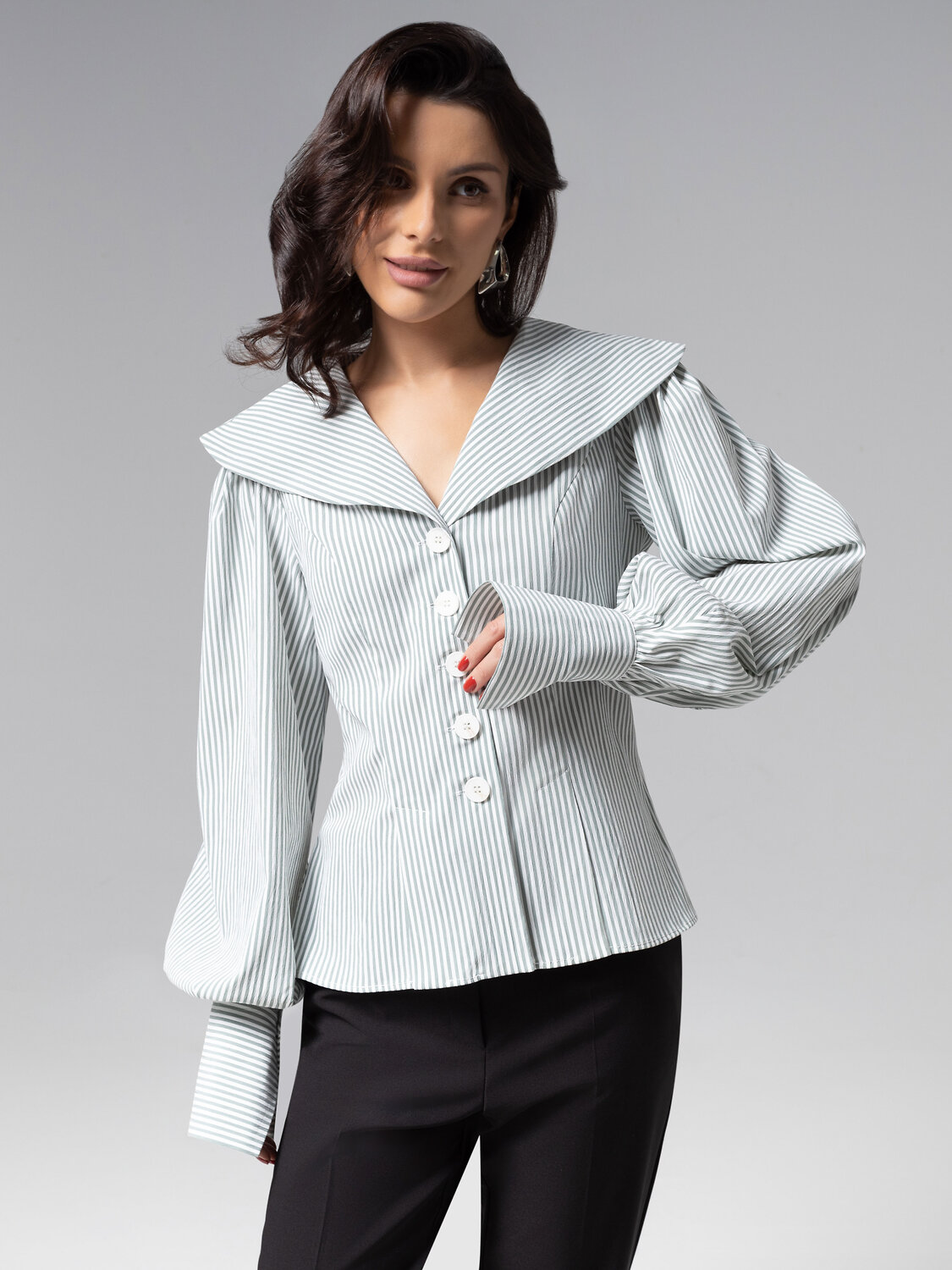 Изысканный приталенный силуэт блузы ЧАРУТТИ приковывает внимание. Широкий воротник, воздушные рукава изделия создают привлекательную игру контрастов. Изделие из премиального смыслового материала, который не потеряет своих свойств после многократных стирок. Безупречный пошив с идеальной посадкой по фигуре демонстрирует мастерство конструкторской мысли и внимание к каждой детали – от разрезов на подоле до оттенка пуговиц. Тонкая полоска на ткани придает образу утонченную глубину, делая блузу универсальным решением как для офиса, так и для светских выходов. Блуза коллекции PREMIUM – воплощение тихой роскоши, где сдержанность кроя встречается с безупречным чувством стиля.