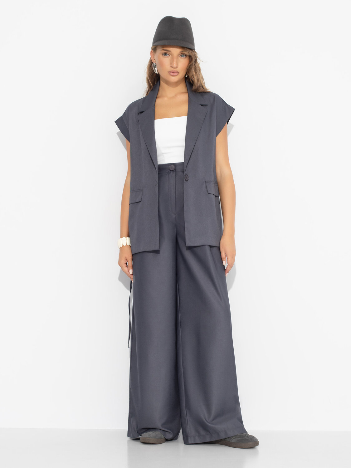 Из clean girl в бизнес-леди за пару секунд. Жилет ЧАРУТТИ в глубоком сером цвете преобразит тебя и подарит окружающим уверенность в твоём всемогуществе. Решение любых вопросов в кратчайшие сроки – это к тебе и к ЧАРУТТИ. Жилет удобренный с лацканами. Имитация карманов. Изделие застегивается на пуговицу в тон материала. Спущенная линия плеча, отвороты прошиты. Жилет можно носить как второй слой или в качестве самостоятельного предмета гардероба.