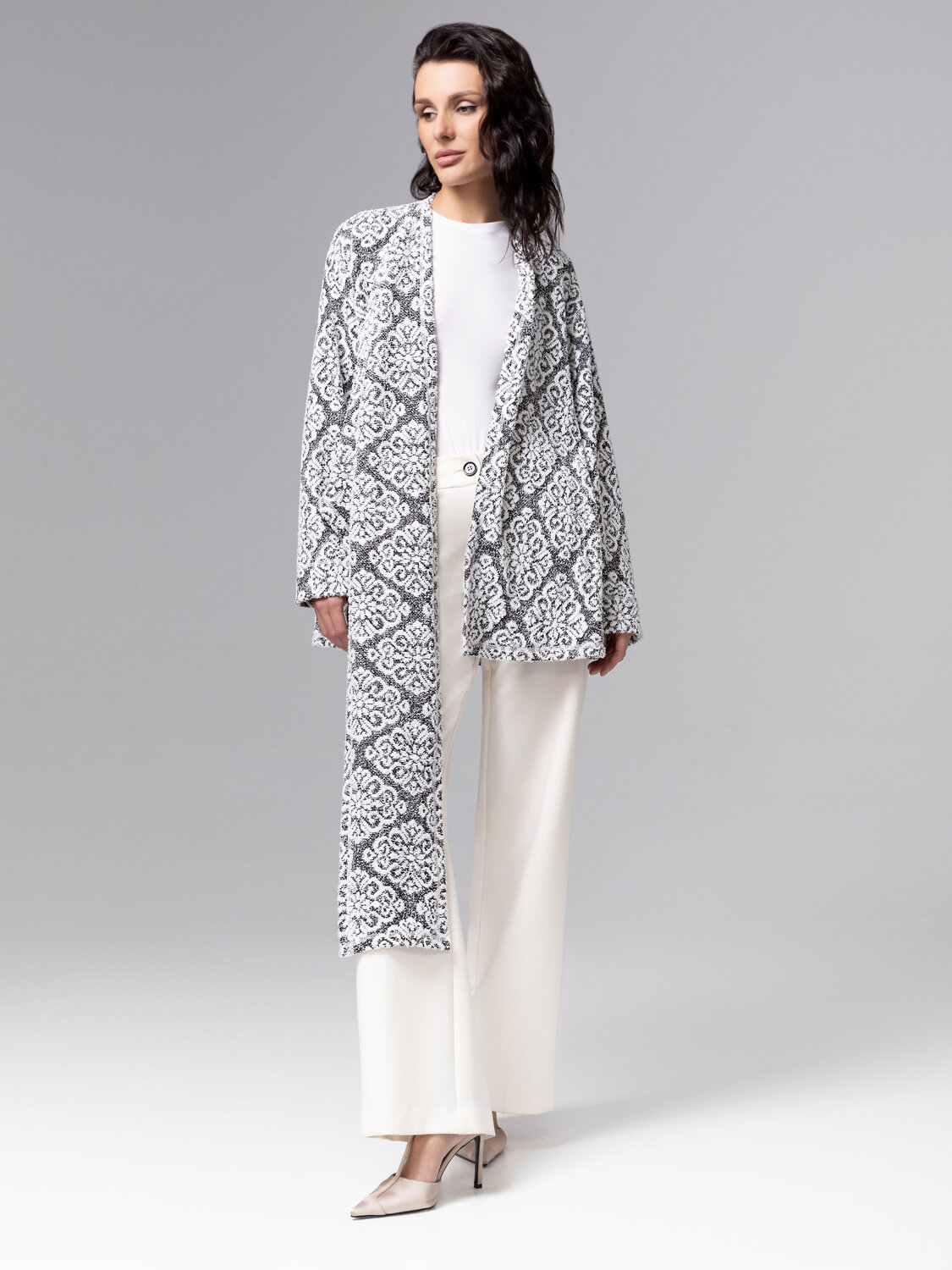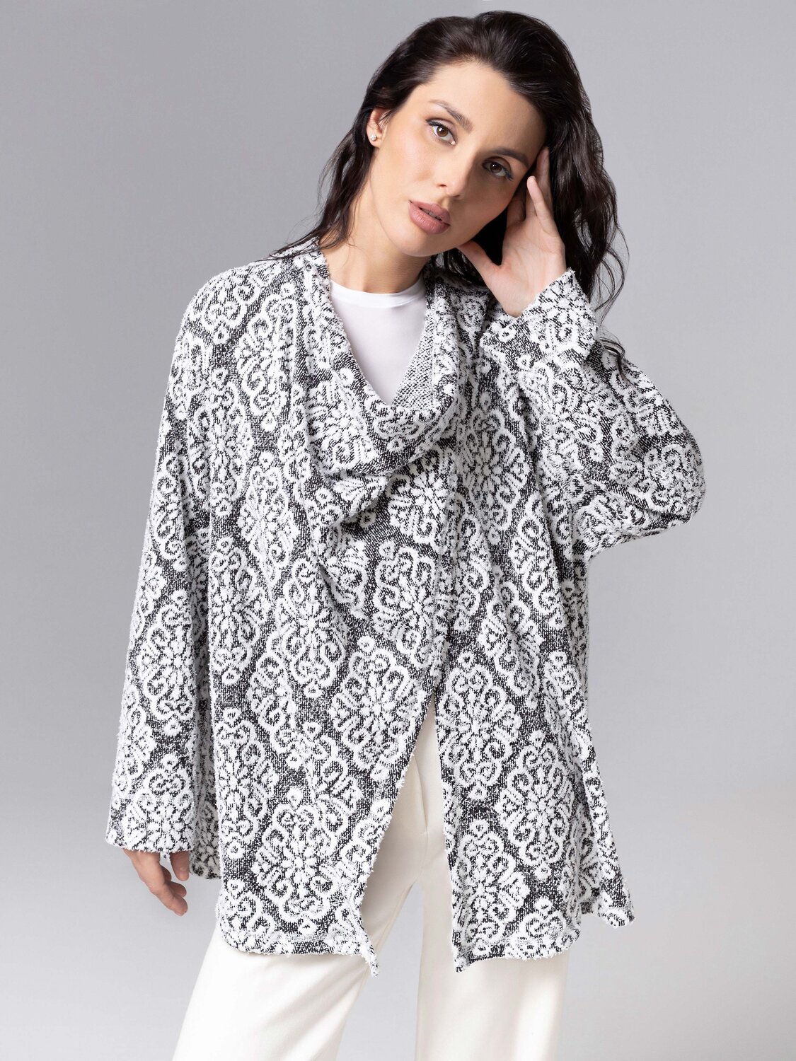 Этот кардиган – как два персонажа в одном: снаружи – деловая серьёзность, внутри – уютный плед для душевных разговоров. Меняйте сторону, как настроение. Вот он – настоящий «Секрет уверенности». Кардиган двустороний. Сложный конструктивный замысел позволяет создавть вариации образов. Многослойная фактура ткани, сочетает мягкость и эластичность высококачественного трикотажа, а крой позаботился о безупречной посадке. Идеально подойдет на любой тип фигуры. Кардиган one size. До 52 размера.