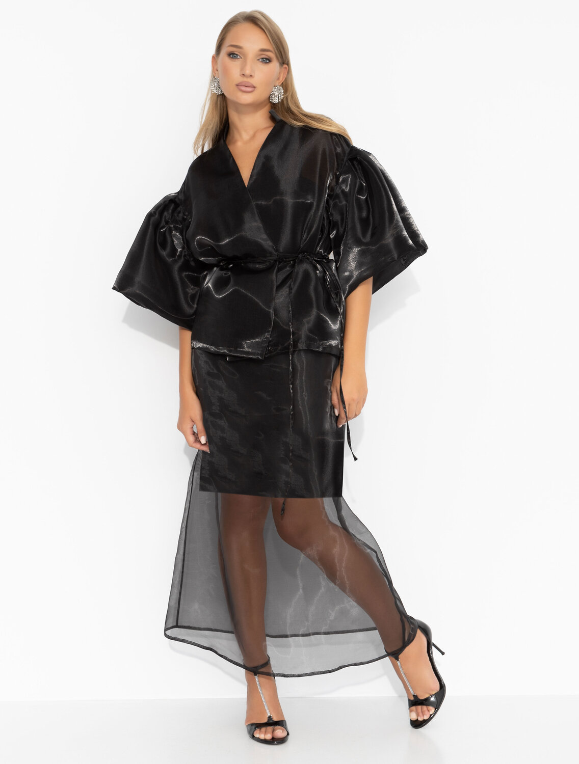 Костюм ЧАРУТТИ – ваш главный союзник в игре на опережение при встрече с бывшим. Безупречный жакет буквально кричит о вашем уверенном успехе, тогда как полупрозрачная юбка дразнит недосягаемым соблазном. Весь образ выстроен на контрасте: он говорит, что вы не просто состоялись, но стали объектом желания, которому он больше не принадлежит. Заставьте его сожалеть. Комплект состоит из юбки в длине миди и жакета. Жакет свободного кроя на запах. Есть тонкий пояс. Юбка с подкладом. Верхний слой из прозрачной органзы. Посадка юбки регулируется. Пояс на резинке.