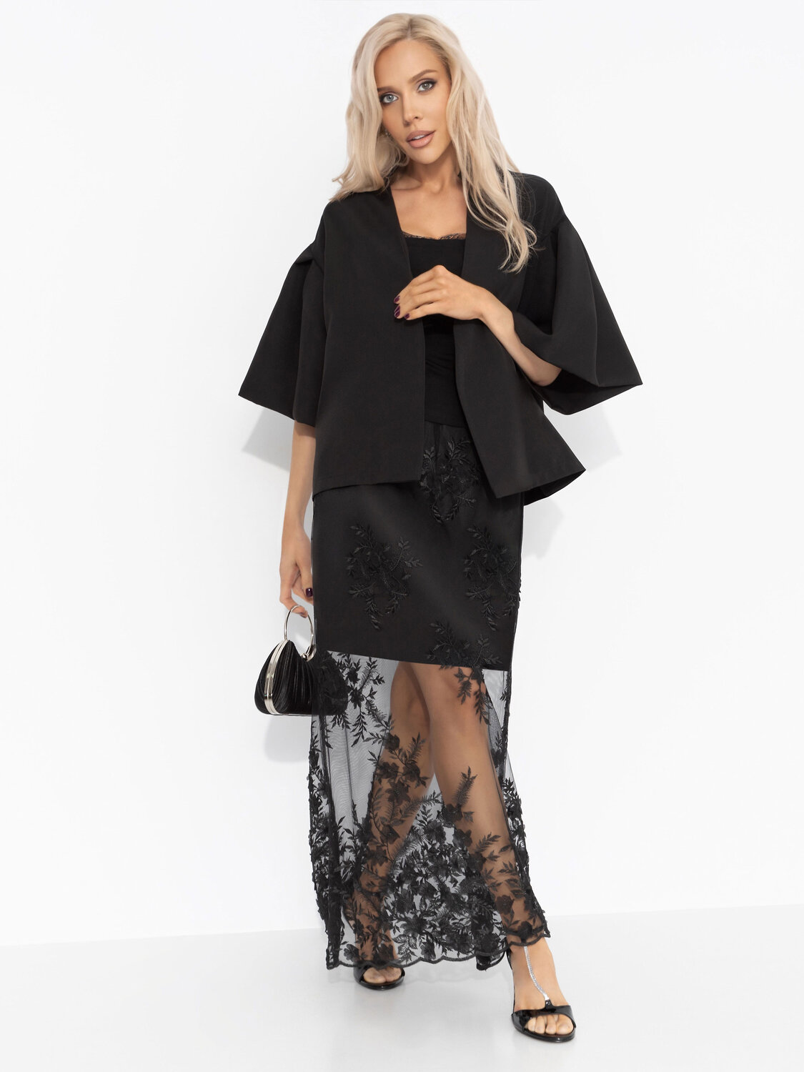 Костюм ЧАРУТТИ – разумная инвестиция в ваш гардероб на все времена. Элегантный жакет нестандартного дизайна, надетый с джинсами или классическими брюками, станет козырем для деловых встреч или светских выходов. Воздушная кружевная юбка добавит таинственности и романтики даже самому простому топу. Сочетаясь вместе, они рождают безупречный праздничный образ, подходящий для самого торжественного события. Комплект состоит из юбки в длине миди и жакета. Жакет свободного кроя на запах. Тонкий пояс в комплекте. Юбка с подкладом. Верхний слой из тонкого кружева. Пояс юбки на резинке.