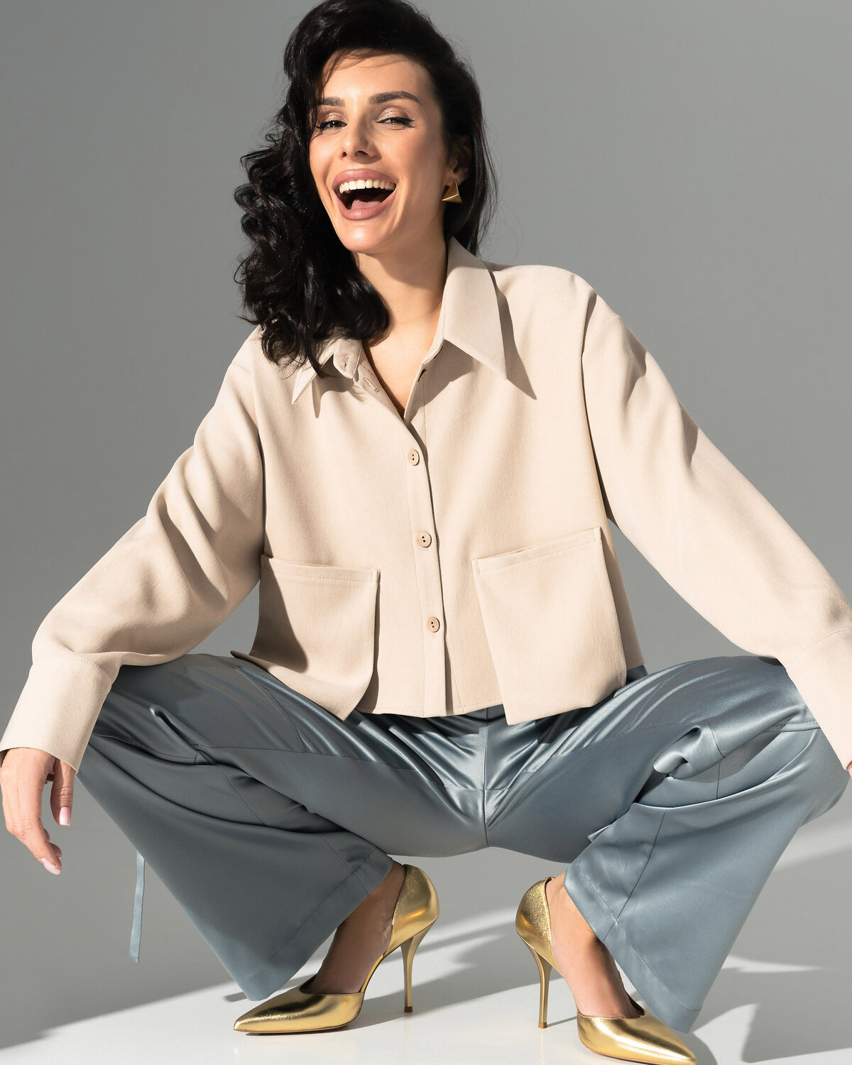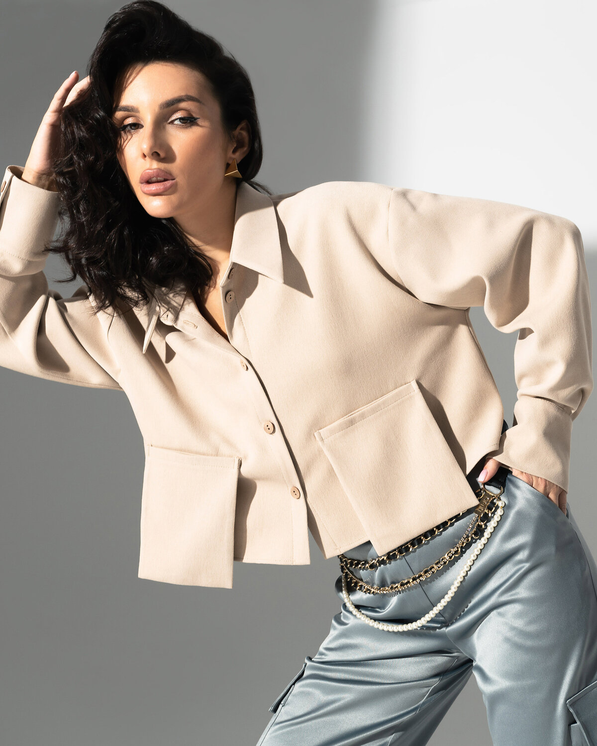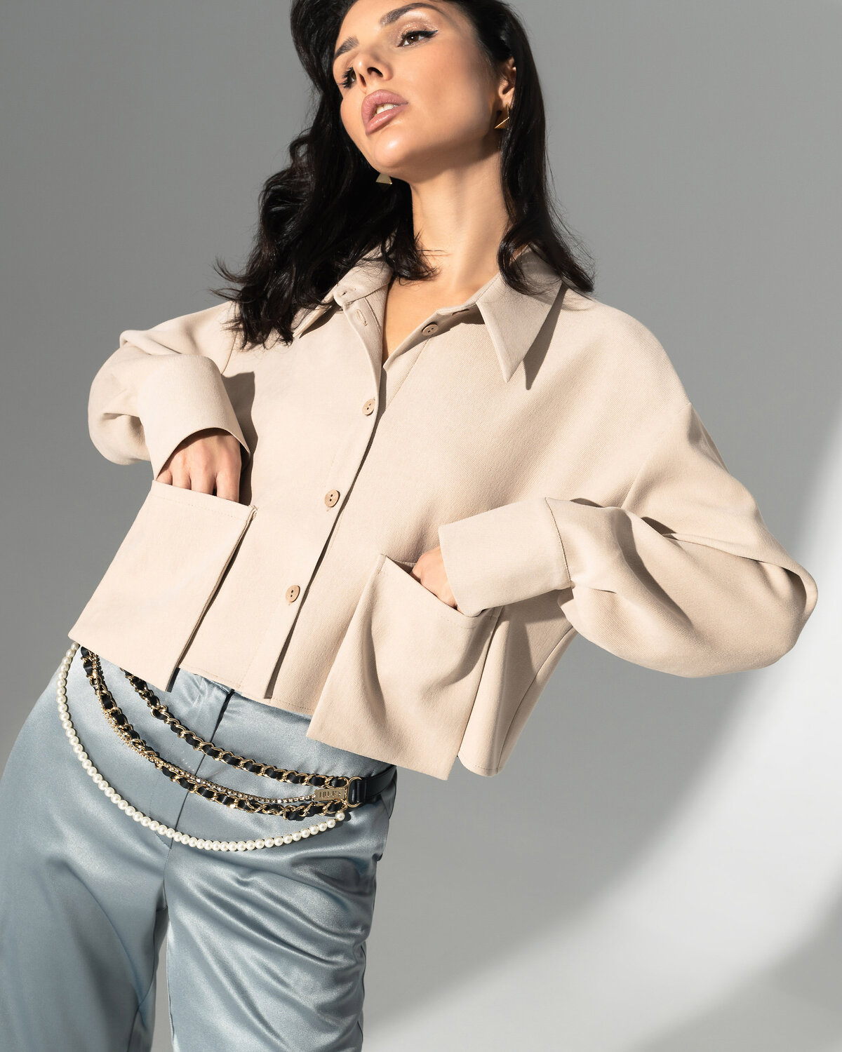 Будем честны, рубашка в оттенке «античный белый» – одна из самых желанных вещей этого сезона. Кроп-длина и накладные карманы – все актуальные тренды в одном изделии.