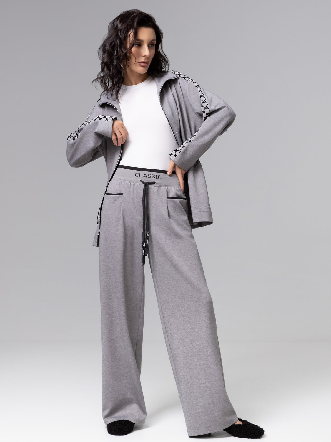 Эти брюки не просто дополняют образ – они диктуют ритм вашему дню. Мягкая ткань играет с пространством, превращая обычную походку в танец. Модель с интегрированными карманами на передней стороне сохраняет безупречную чистоту кроя, подчеркивая сдержанную элегантность. Широкая трикотажная резинка на поясе обеспечивает комфорт и современный вид, идеально контрастируя с благородным серым оттенком ткани.