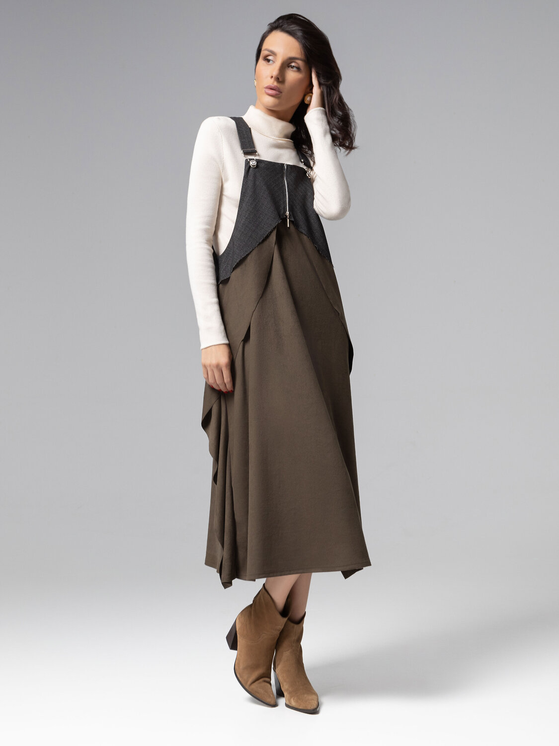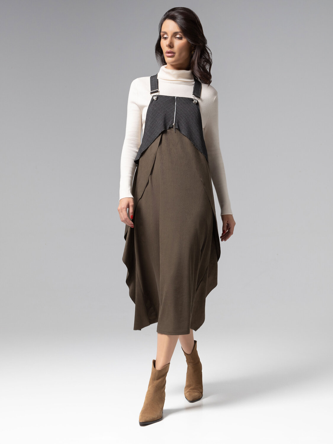 Сарафан-миди в оттенках хаки: авангардная элегантность. Свободный новаторский крой, сочетающий трендовую экозамшу и костюмную ткань премиального качества, создаёт архитектурный силуэт со шлейфом восточной философии. Воздушные рюши по бокам подчёркивают игру света на сложной поверхности ткани. Сарафан ЧАРУТТИ представляет собой манифест роскошного casual, где комфортный крой встречается с нетривиальным дизайном.