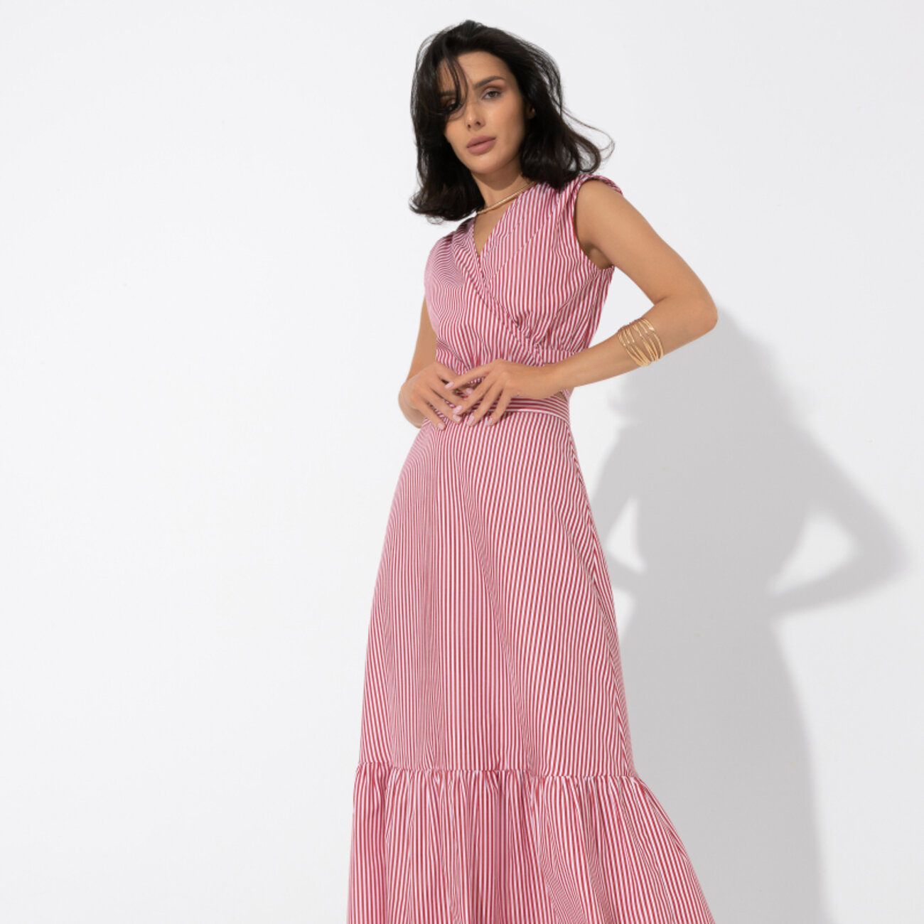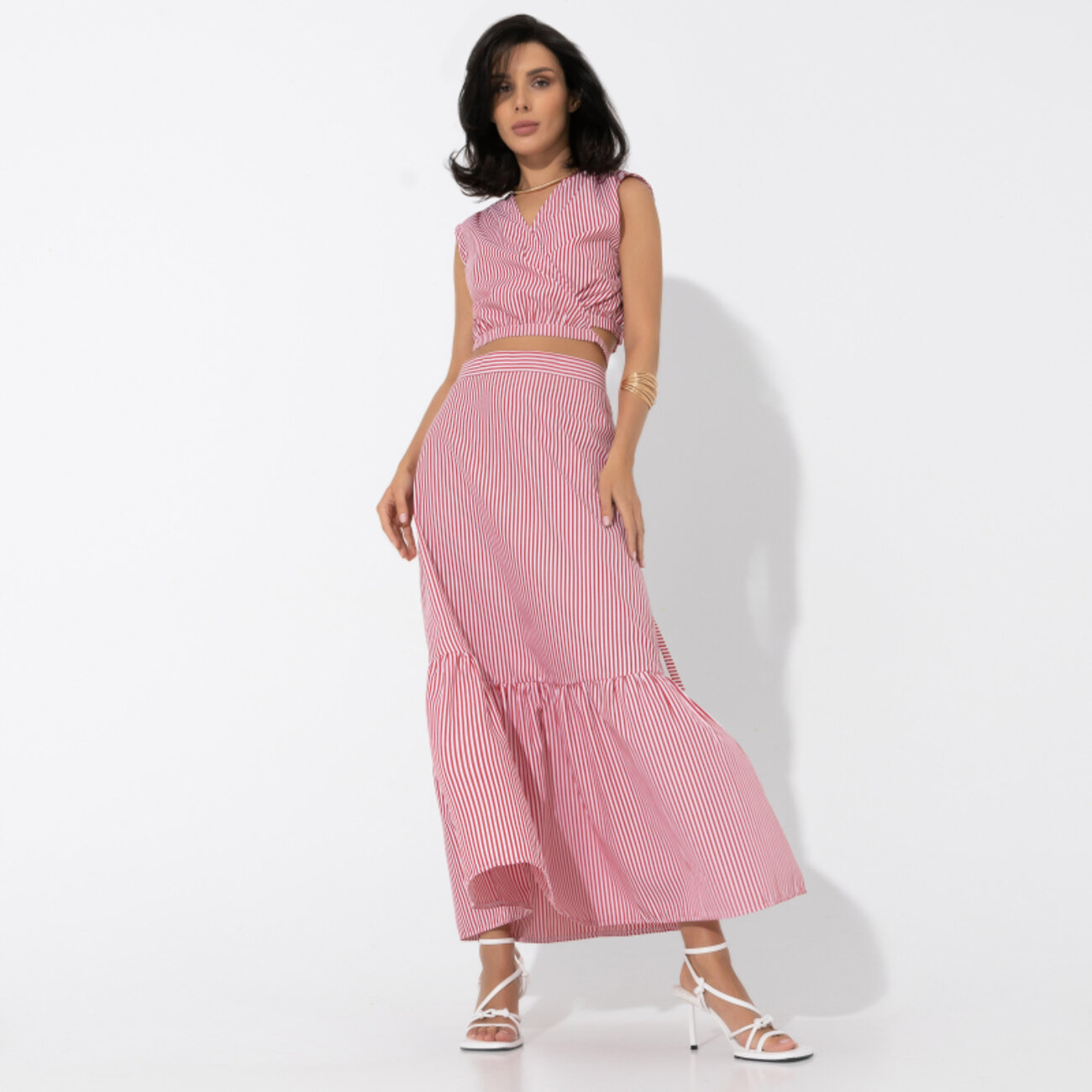 Лето и морской стиль – ассоциация на века. В новом комплекте задействовано беспроигрышное сочетание трендов: кроп-топ и юбка макси. Сочетание длины и полоски дают актуальный удлинённый силуэт.