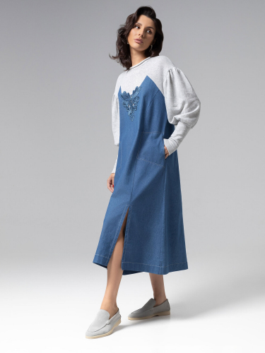 Платье ЧАРУТТИ в длине миди совершает революцию в casual-эстетике, соединяя мягкость футера с графичной фактурой премиальной джинсы в неожиданной гармонии. Безупречный крой с продуманными рельефами создает идеальную геометрию, где каждый шов подчеркивает женственный силуэт без намека на банальность. Экспериментальное сочетание тканей – мягкий хлопковый трикотаж и эластичная джинса дополнены текстурной вышивкой. Уникальный тактильный опыт и комфорт нового уровня. Платье звучит как гимн современной женщине. Издедие с карманами.
