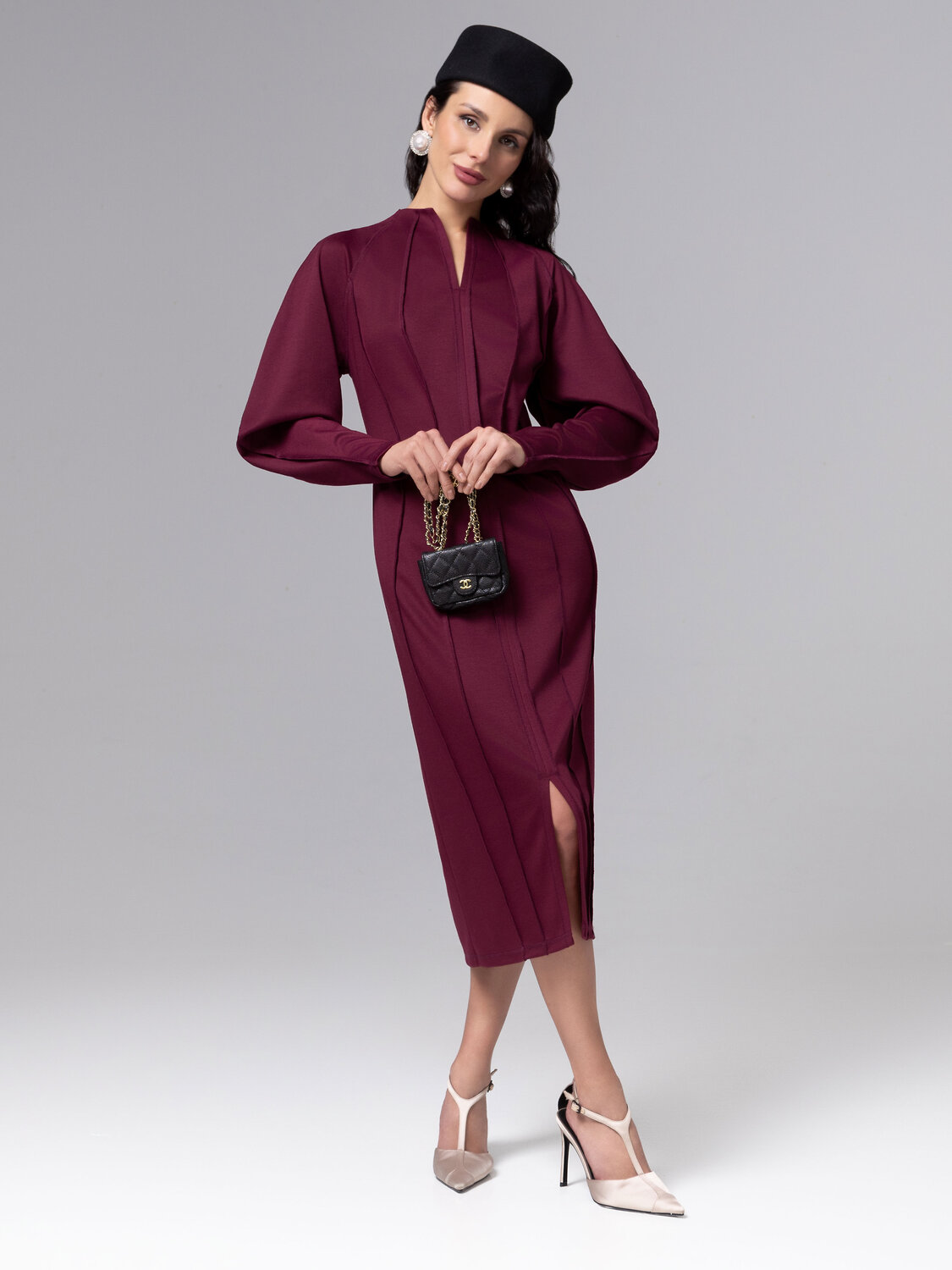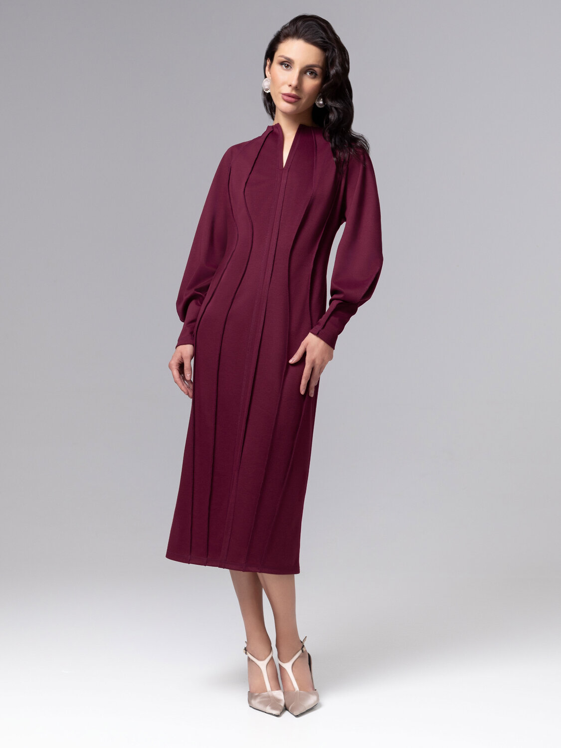Платье коллекции PREMIUM полуприлегающего силуэта в роскошном цвете бордо воплощает современную элегантность с акцентом на безупречную конструкцию. Трендовые внешние швы не только подчеркивают изящные линии фигуры, но и выступают художественным элементом, добавляя образу выразительности. Идеальный пошив проявляется в точном соблюдении пропорций, безукоризненной стыковке деталей и использовании технологии, обеспечивающей идеальную посадку без скованности движений.