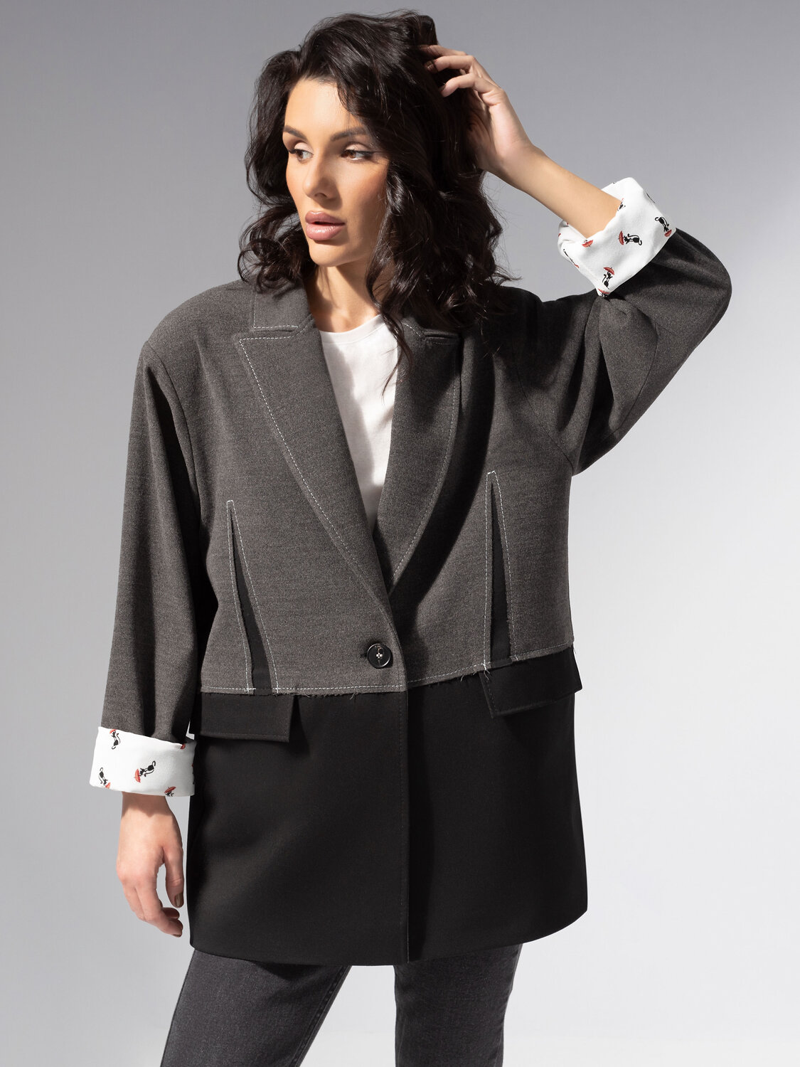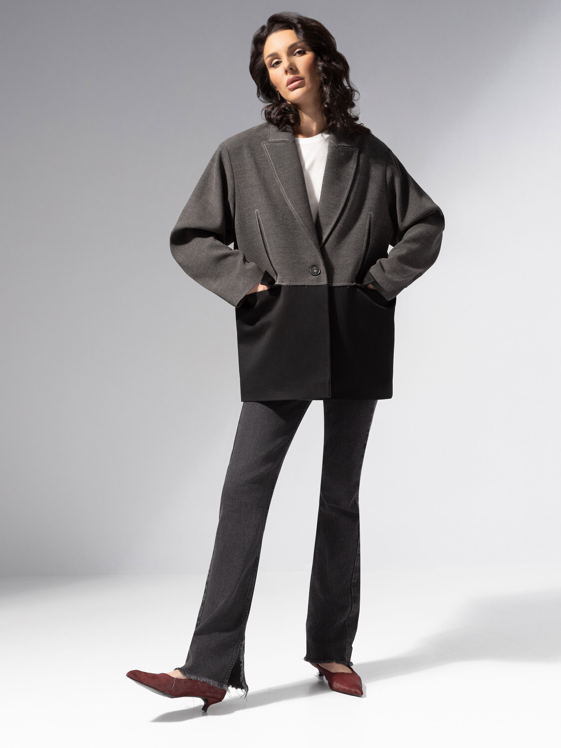В жизни, как в шахматах, решительный ход делает сильная фигура. Жакет ЧАРУТТИ – про уверенность и умение управлять вниманием. Монохром, игра фактур и архитектурный крой – всё, что нужно для победного образа. Комбинированный жакет из двух видов костюмной ткани. Чёткая линия плеч, свободный силуэт, застёжка на одну пуговицу. Акцентные швы и геометричные вставки.