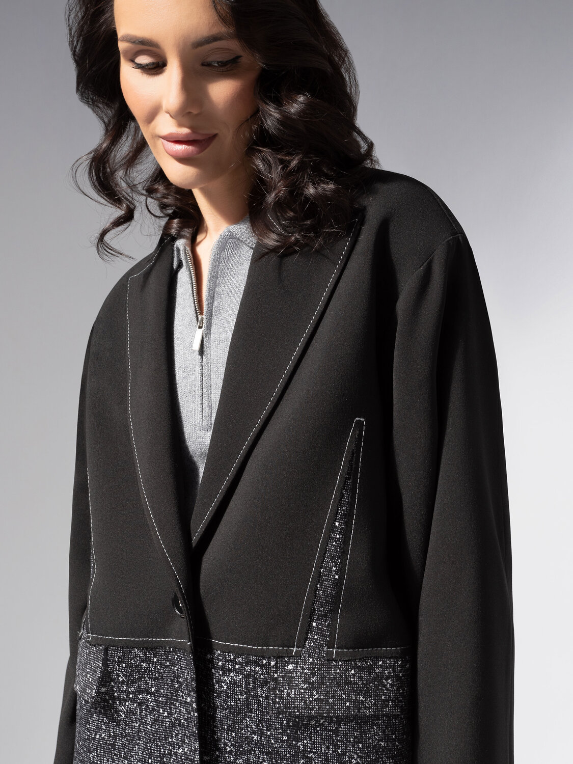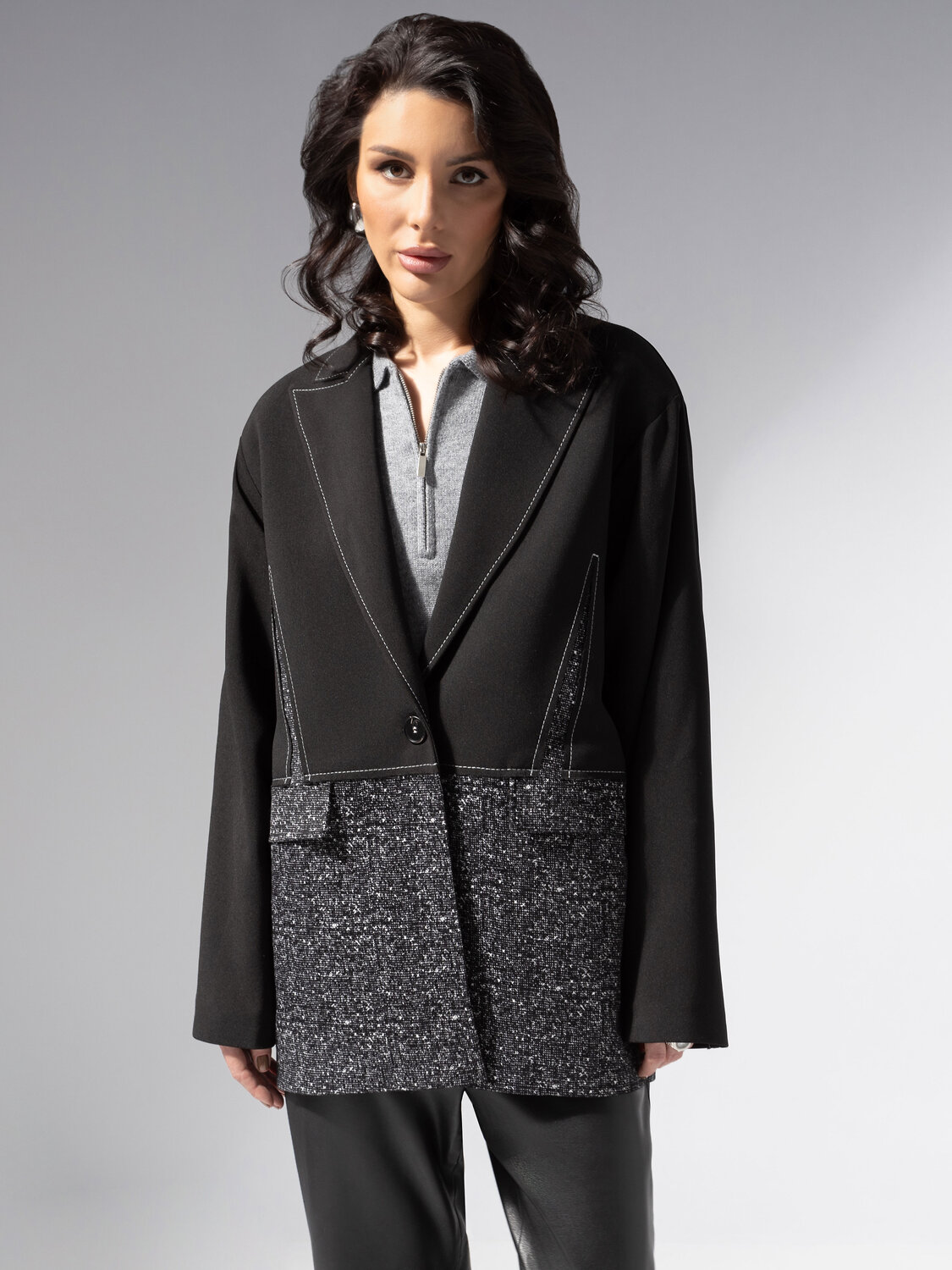Этот жакет – как шахматная королева: спокойный, но стратегически точный. Дизайнеры ЧАРУТТИ сделали ставку на контраст гладкости и шероховатости, превратив классику в арт-объект. Для тех, кто видит силу в деталях. Модель свободного кроя с геометричными линиями и контрастной нижней вставкой. Сочетание трёх тканей: «пикачо», флак и «плат кагзи». Одинарная застёжка, английский воротник, декоративные швы. Жакет свободной посадки на подкладе с подплечниками.