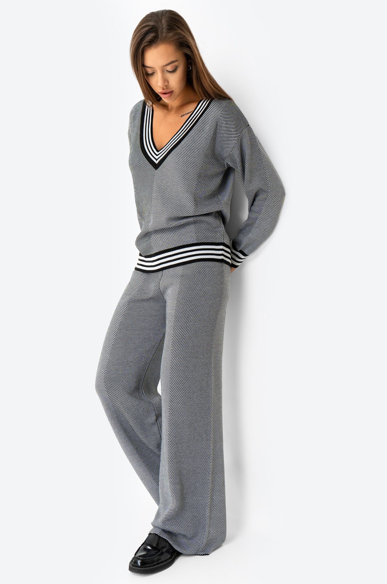 Он точно покорит ваше сердце! Женский ..показатькостюм из вязаного трикотажа в серых оттенках с диагональной полоской — идеальный выбор для стильных и уверенных в себе леди.