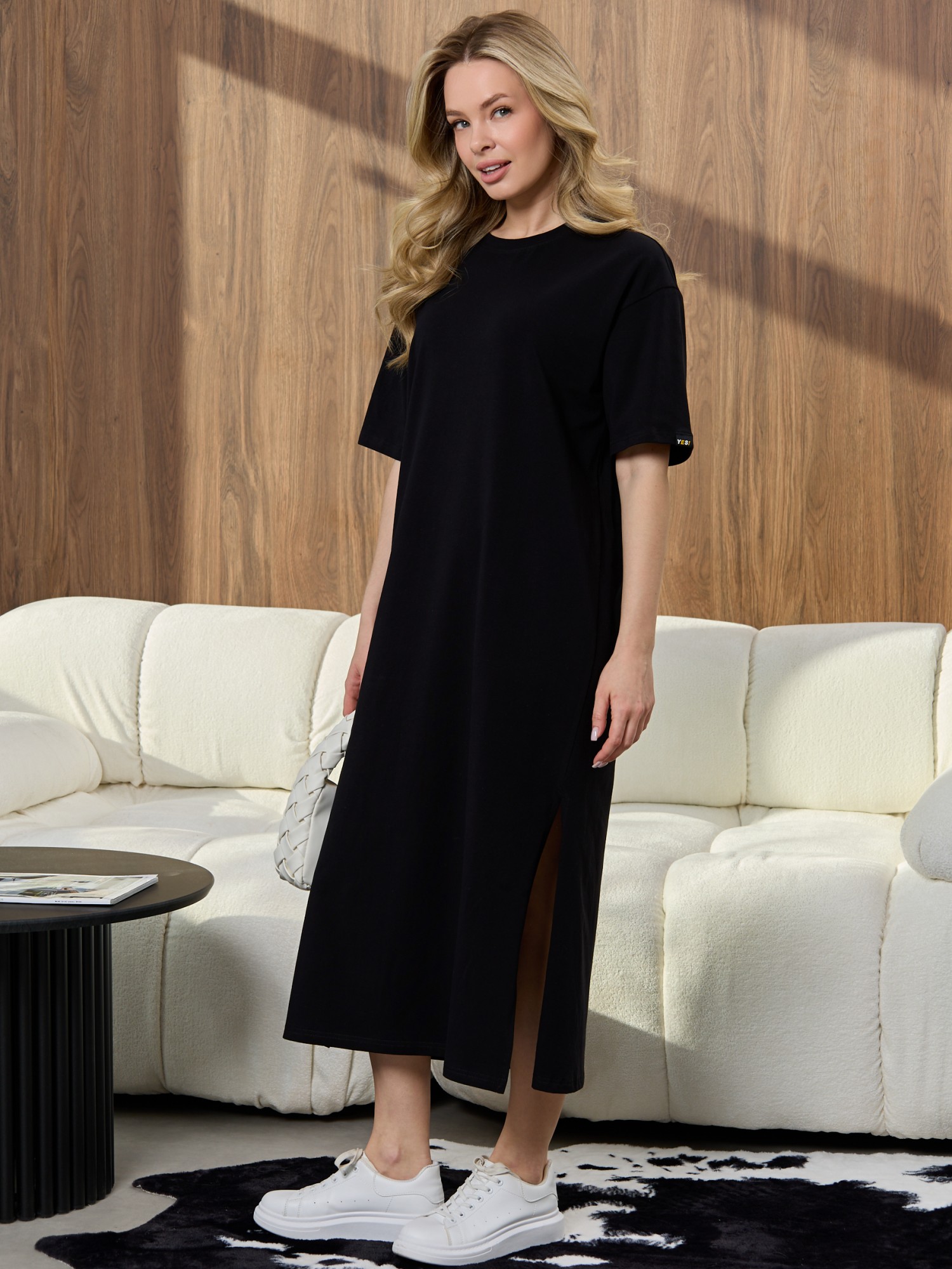 Туника женская из гладкокрашеного трикотажного полотна «кулирка» с лайкрой, прямого силуэта, со спущенной линией плеча, короткими втачными рукавами, горловиной овальной формы, обработанной втачной планкой из основного материала, с разрезами в боковых швах. Левый рукав дополнен декоративным элементом.
