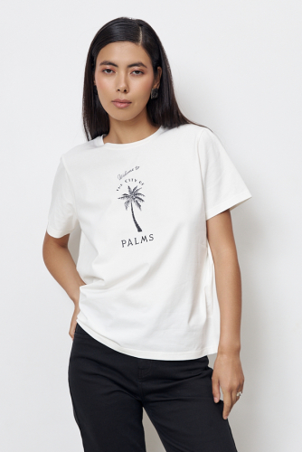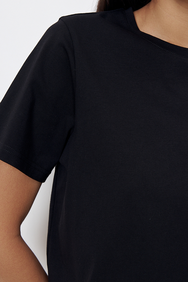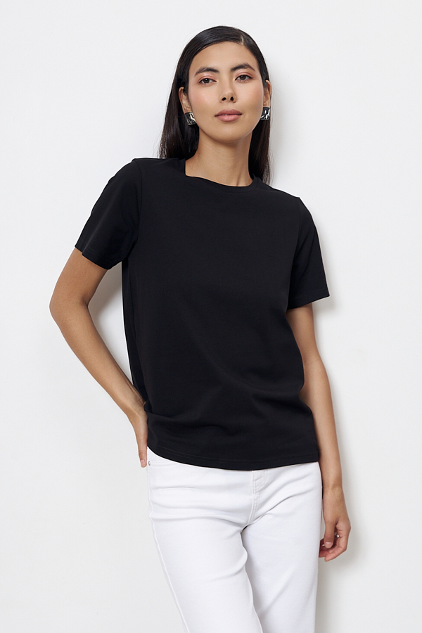 Джемпер из хлопкового эластичного полотна свободного силуэта. Втачной короткий рукав. Круглый вырез горловины оформлен бейкой.
