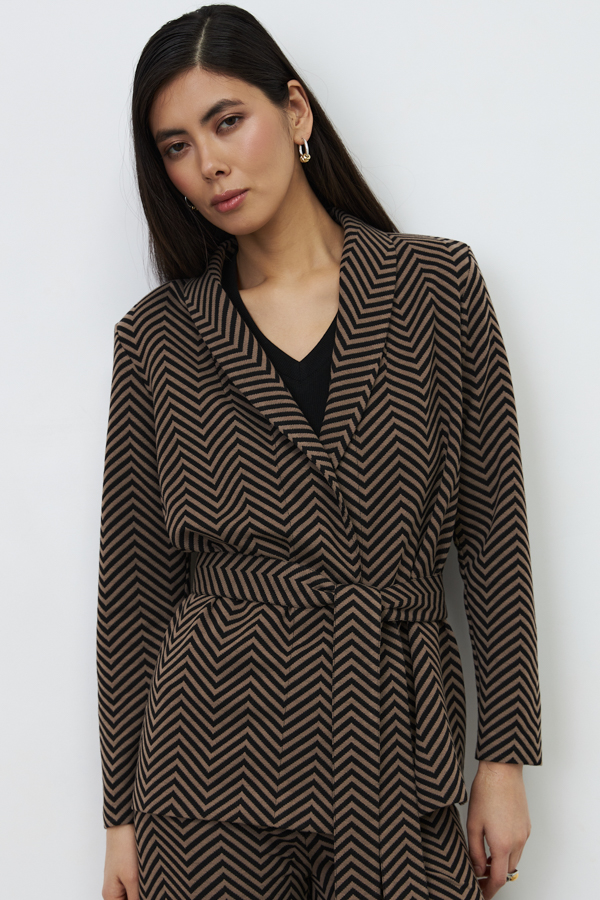 Костюм из эластичного полотна. Брюки прямого силуэта. Пояс с эластичной резиной. Жакет прямого свободного кроя с женственным шалевым воротником. Втачной рукав. В комплекте пояс из основной ткани, позволяющий создавать приталенный силуэт. Изделие с плечевыми накладками, которые при желании можно убрать.