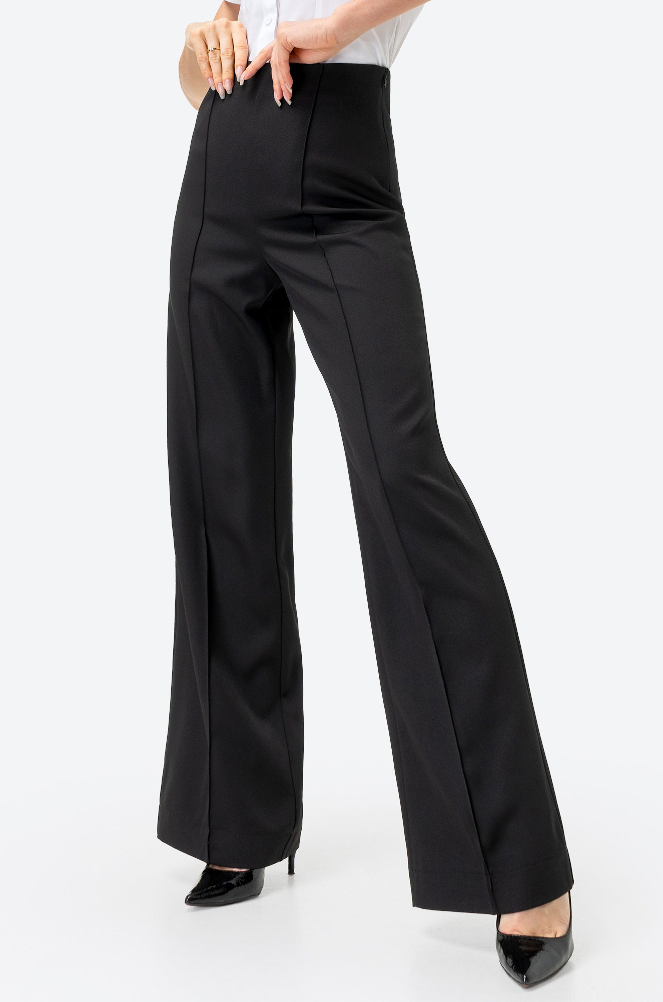 Однотонные штаны с высокой посадкой сделают силуэт стройнее и изящнее, продуманная длина под каблук выгодно подчеркнет и скорректирует фигуру. Эффектные стрелки визуально стройнят силуэт и удлиняют ноги.