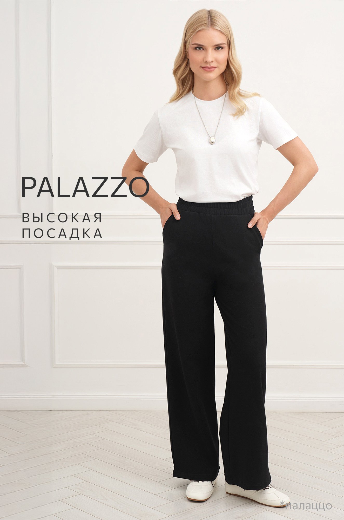 Чёрные женские брюки палаццо созданы, ..показатьчтобы дарить свободу движения и уверенность в каждом шаге. Мягкий хлопковый трикотаж делает их особенно приятными и удобными на каждый день.