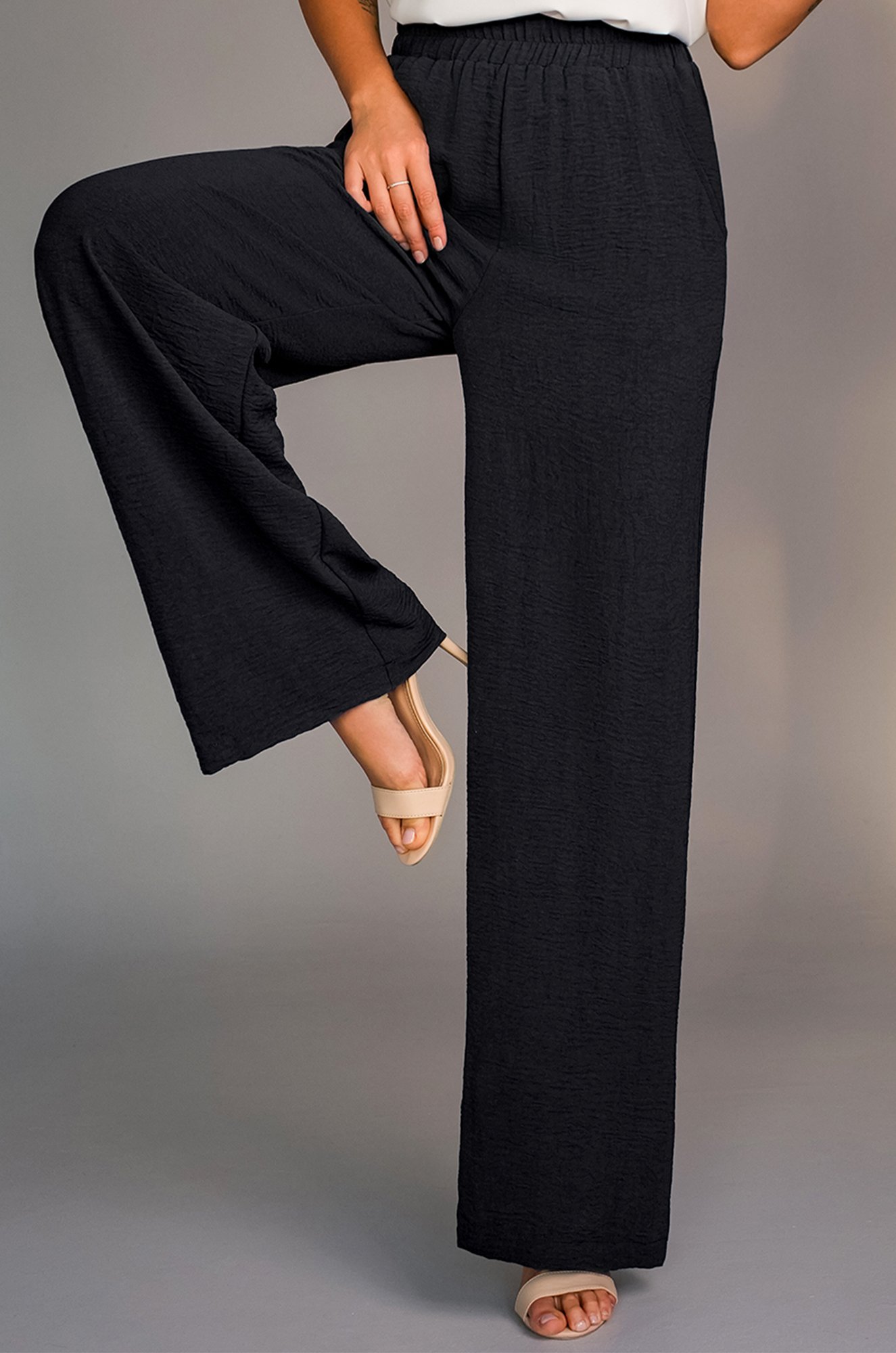 Стильные женские брюки палаццо выполнены из тонкой ткани жатка, которая имеет рельефную текстуру. Широкие штаны на резинке в поясе отлично подойдут на лето. По бокам предусмотрены удобные карманы.