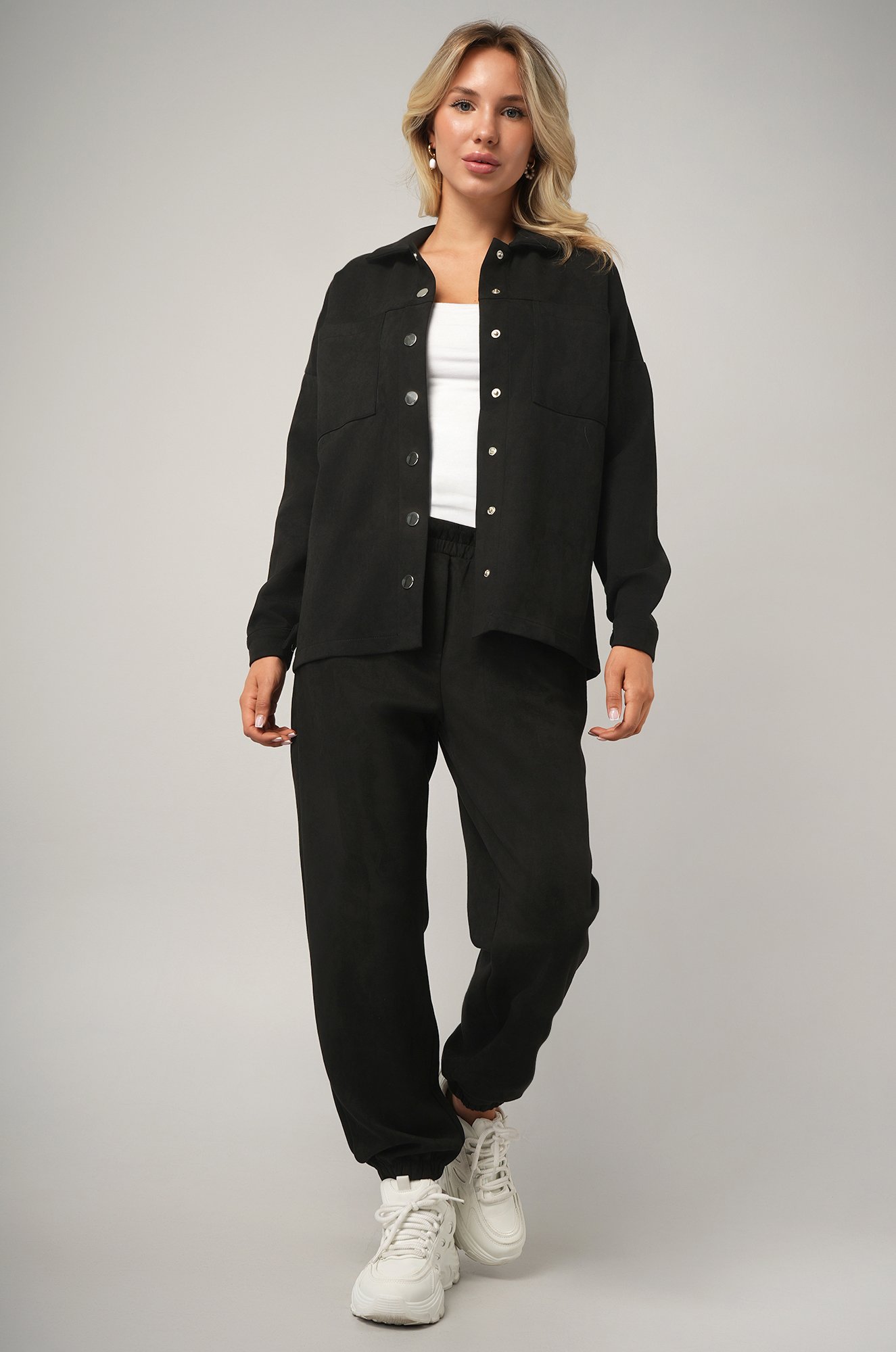 Черный бр..показатьючный костюм оверсайз выполнен из экозамши ― плотного и мягкого материала.